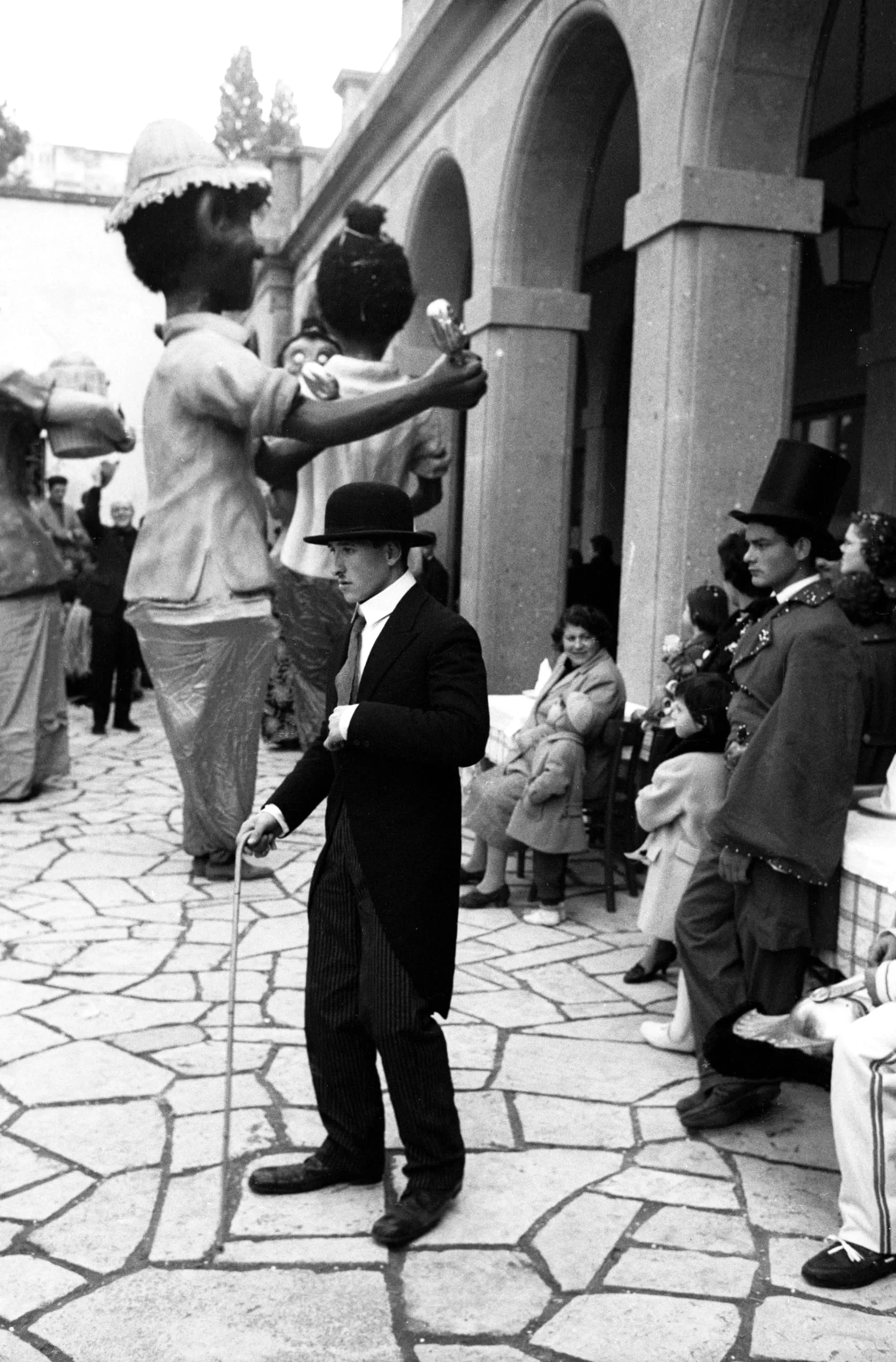 Black and white photograph of costumed performers in a stone courtyard, including a man in a bowler hat and tailcoat with a cane and towering bronze-painted stilt figures behind him