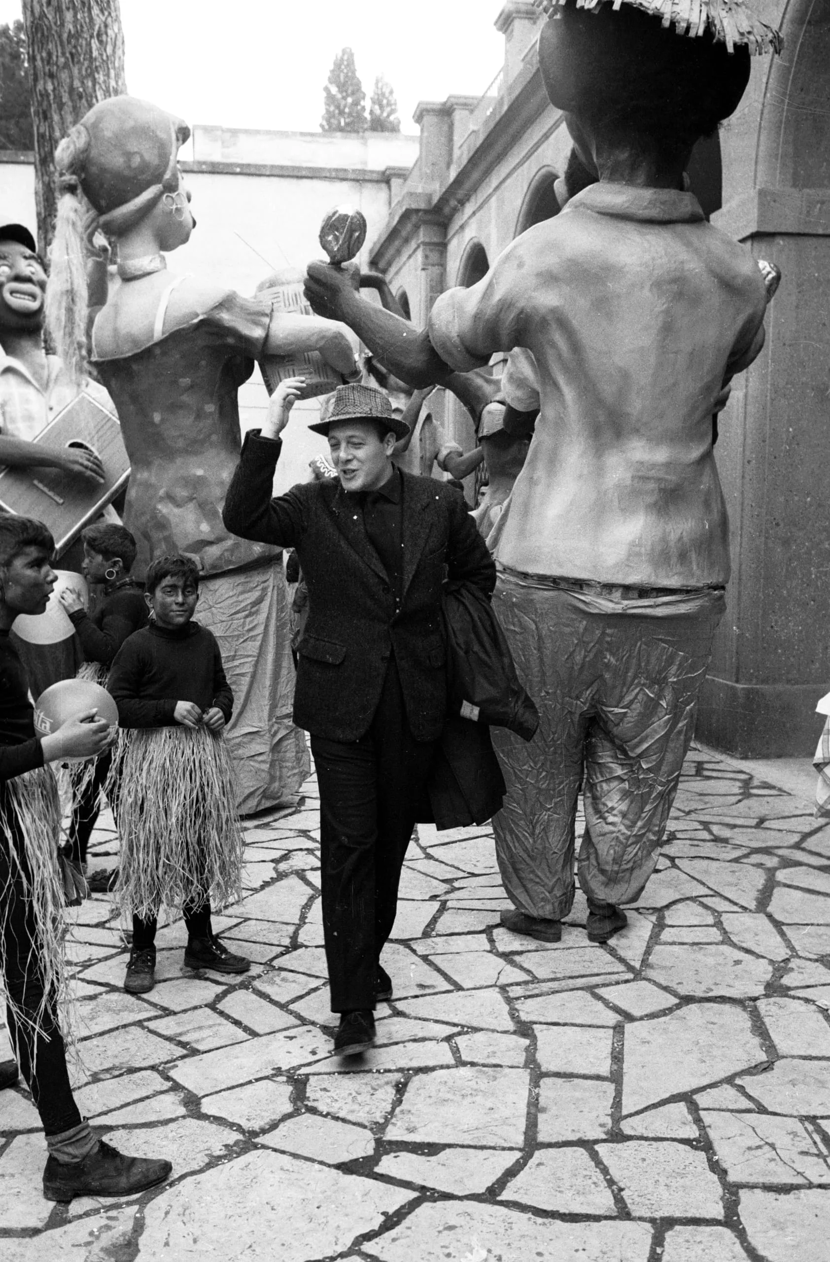 Black and white photograph of a man in a straw hat and dark jacket walking among oversized figurative sculptures in a stone courtyard, surrounded by several onlookers