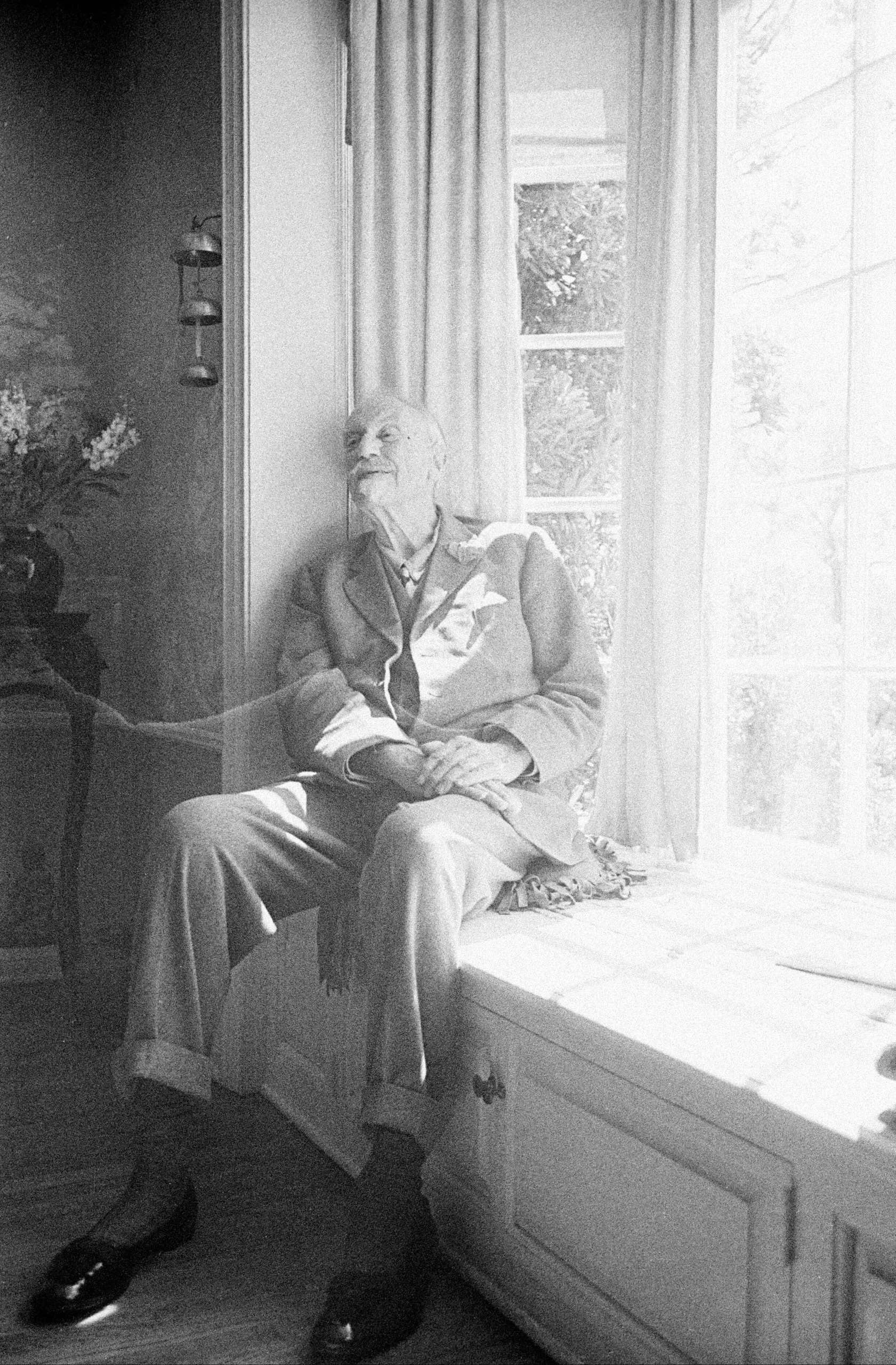 Black and white photograph of an elderly person with white hair and beard seated on a window ledge, head tilted toward bright natural light, hands clasped in lap