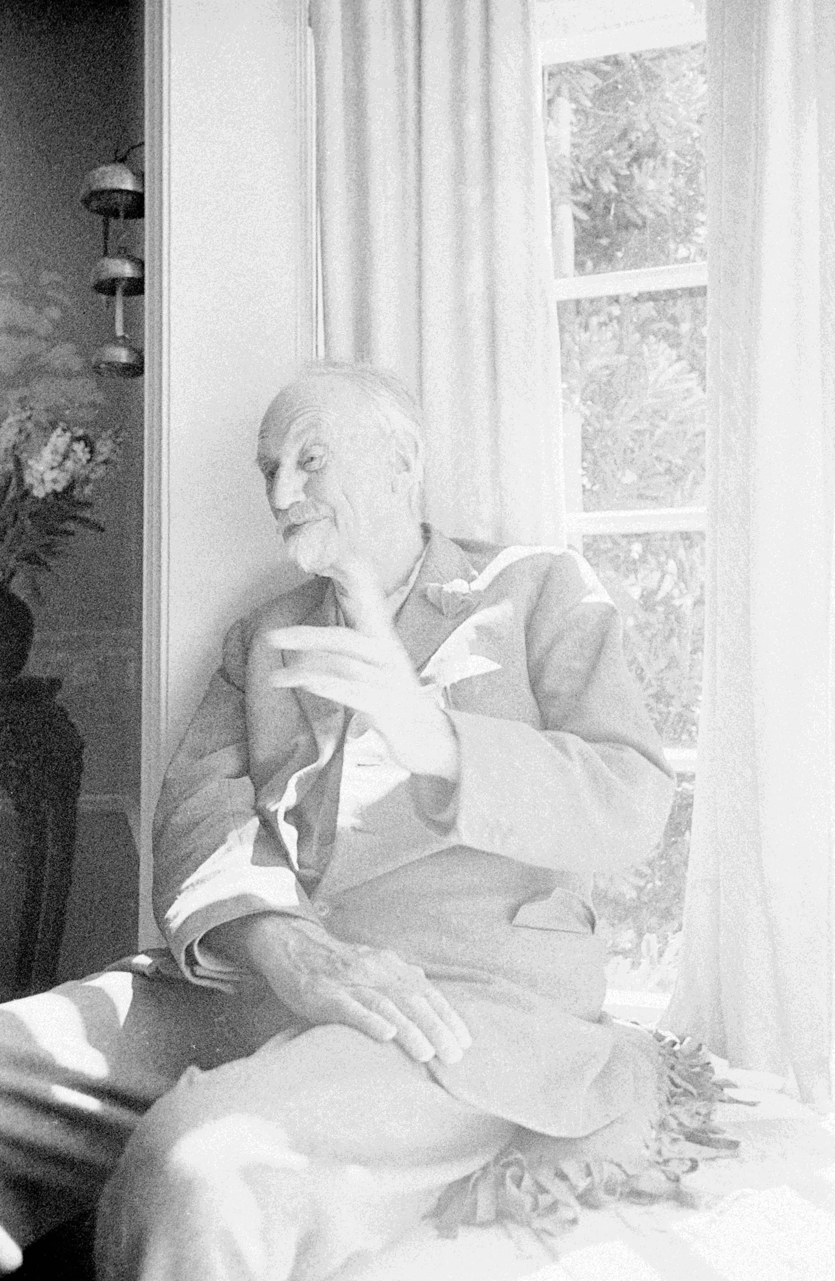 Black and white photograph of an elderly white man seated by a bright window, wearing a light blazer, one hand raised near his chin, with deep shadows to his left