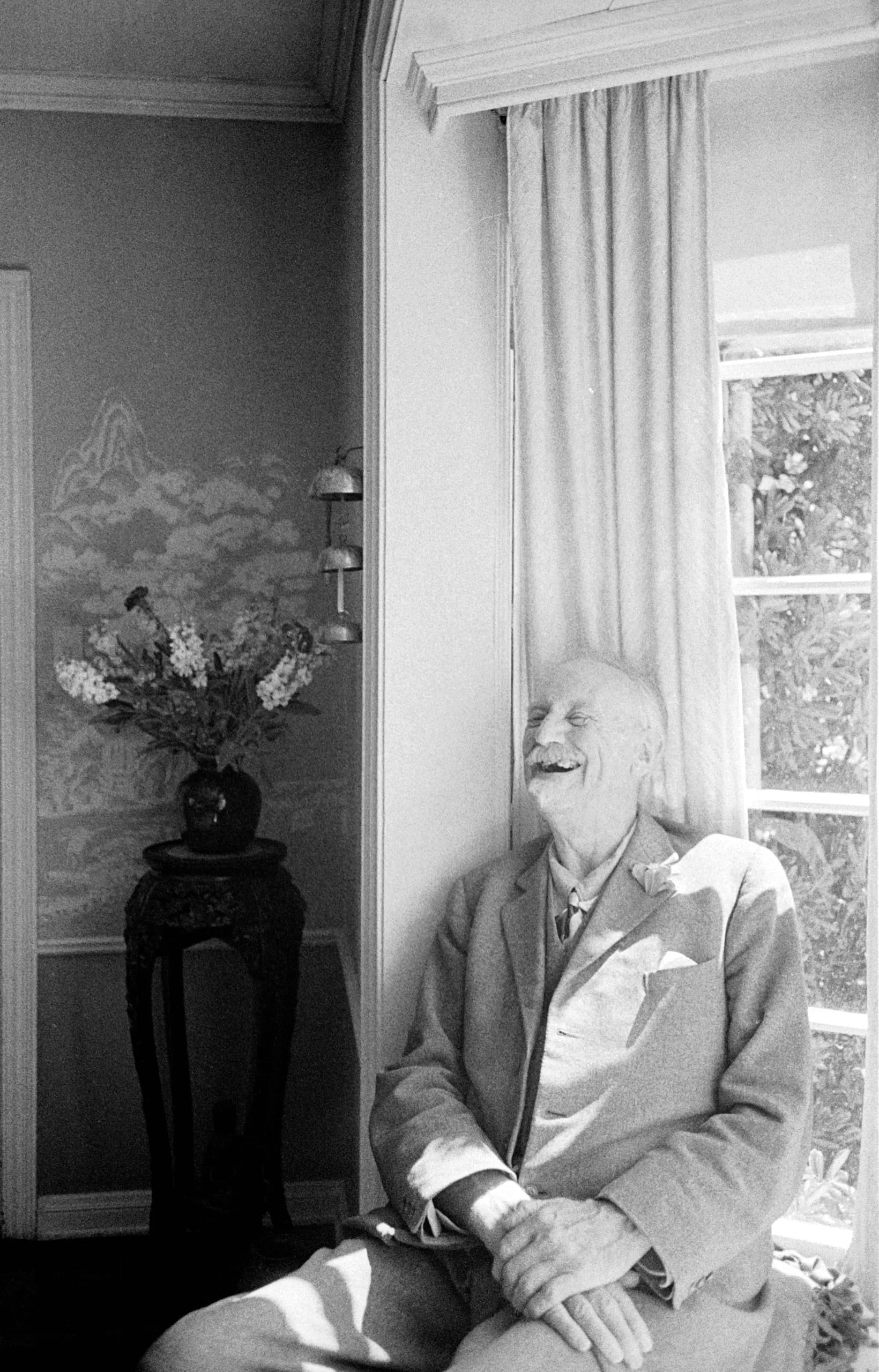 Black and white photograph of an elderly white man seated by a sunlit window, head tilted back, mouth open in laughter, wearing a light blazer