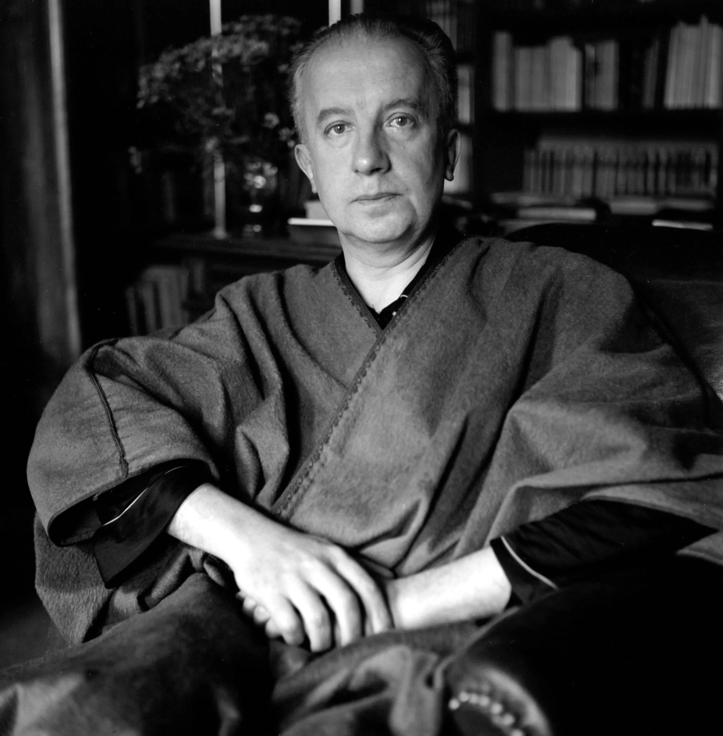 Black and white portrait photograph, a man in a wide-sleeved wrap robe seats facing the camera, hands clasped in lap, bookshelves out of focus behind him