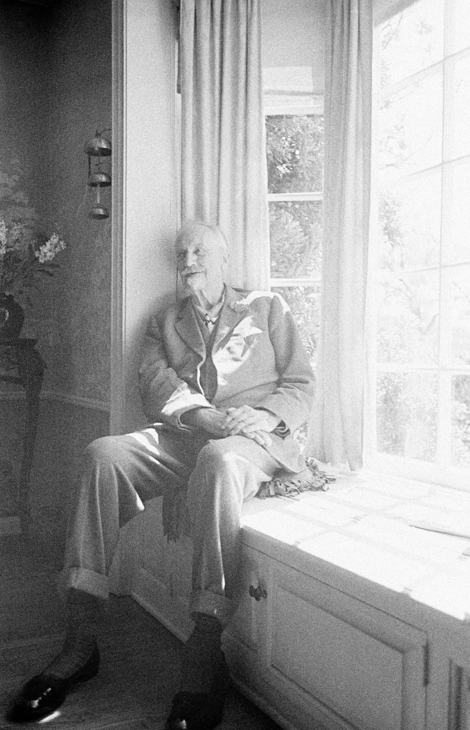 Black and white photograph, full-length portrait of an elderly white man in a sport coat and tie seated on a sunlit window bench, hands folded in lap, head tilted upward