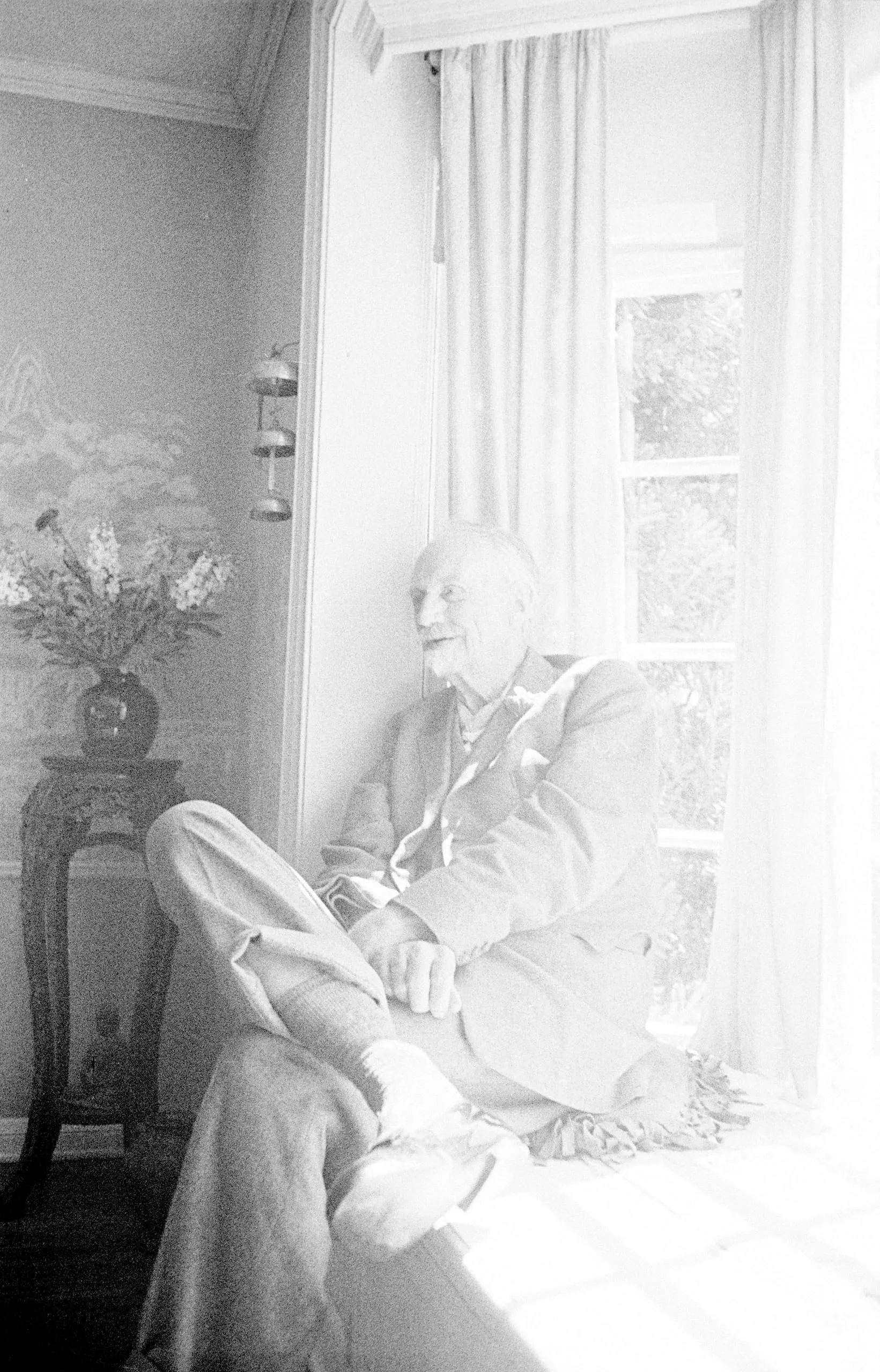 Black and white photograph, elderly man in a light suit seated on a window bench, legs crossed, looking toward a bright curtained window