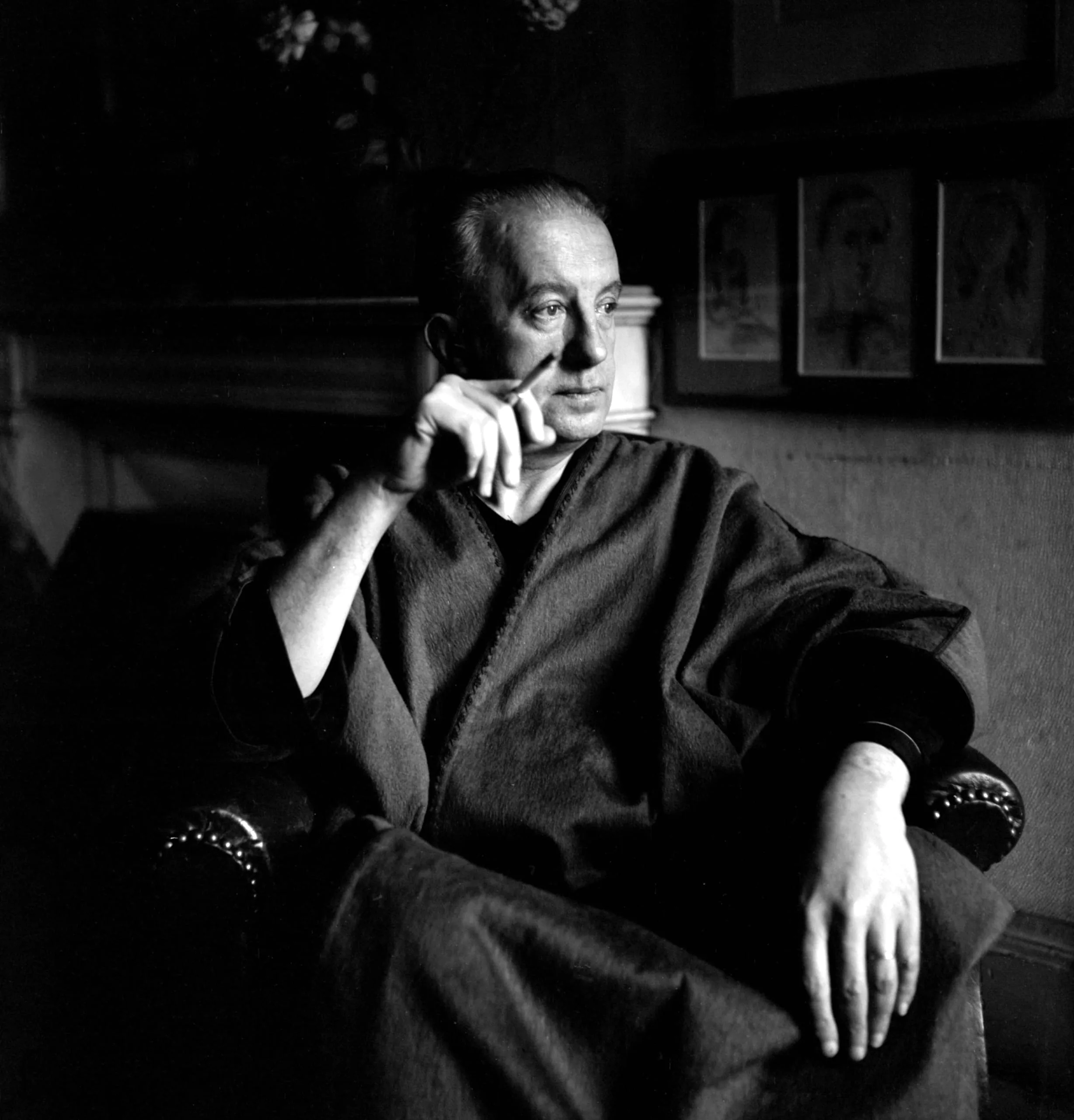 Black and white portrait photograph of a seated man in a loose dark robe, one hand raised near his chin, lit from the left with deep shadows