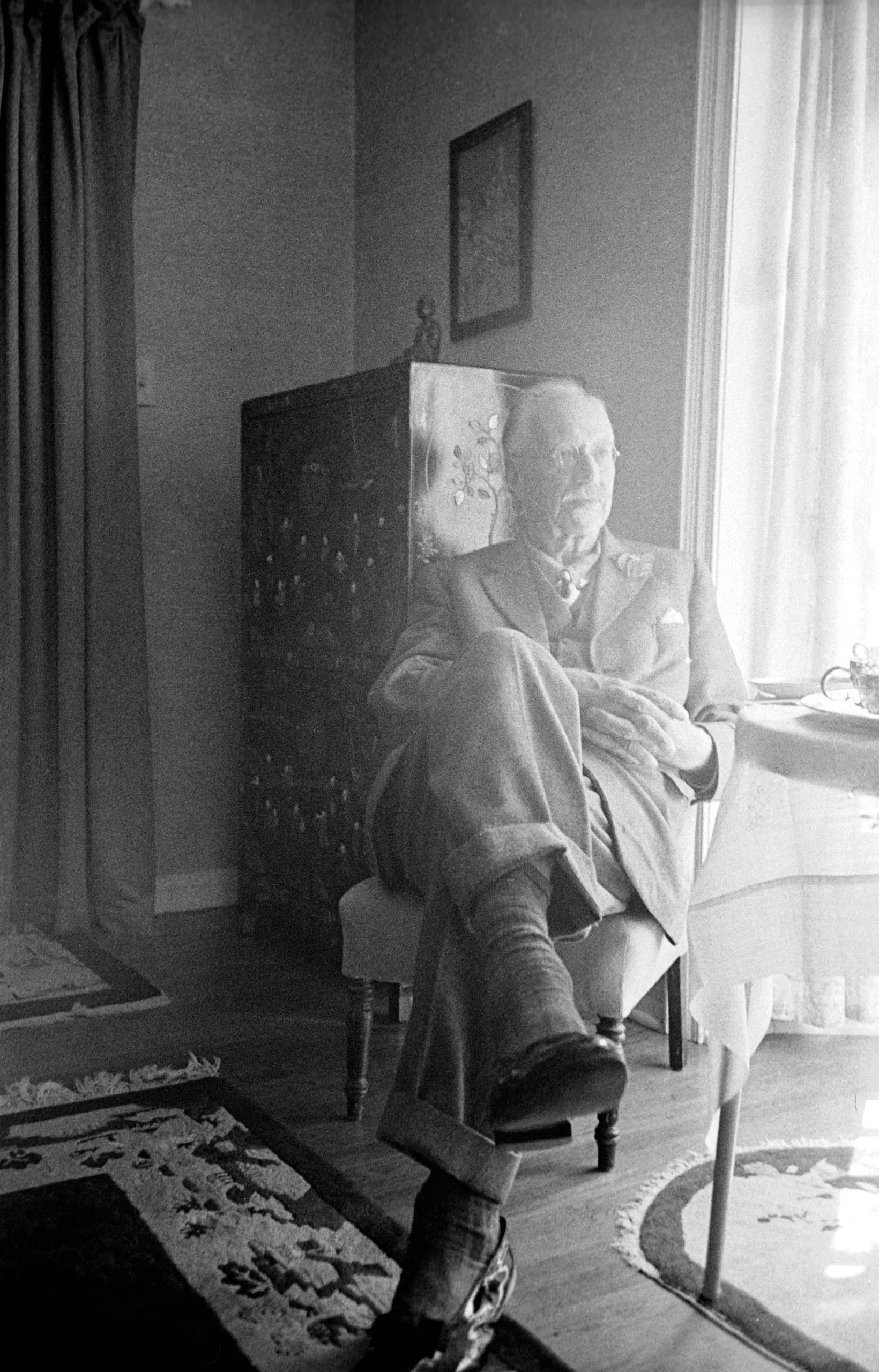 Black and white photograph of an elderly man in a light suit seated in an armchair, legs crossed, beside a bright window in a furnished room