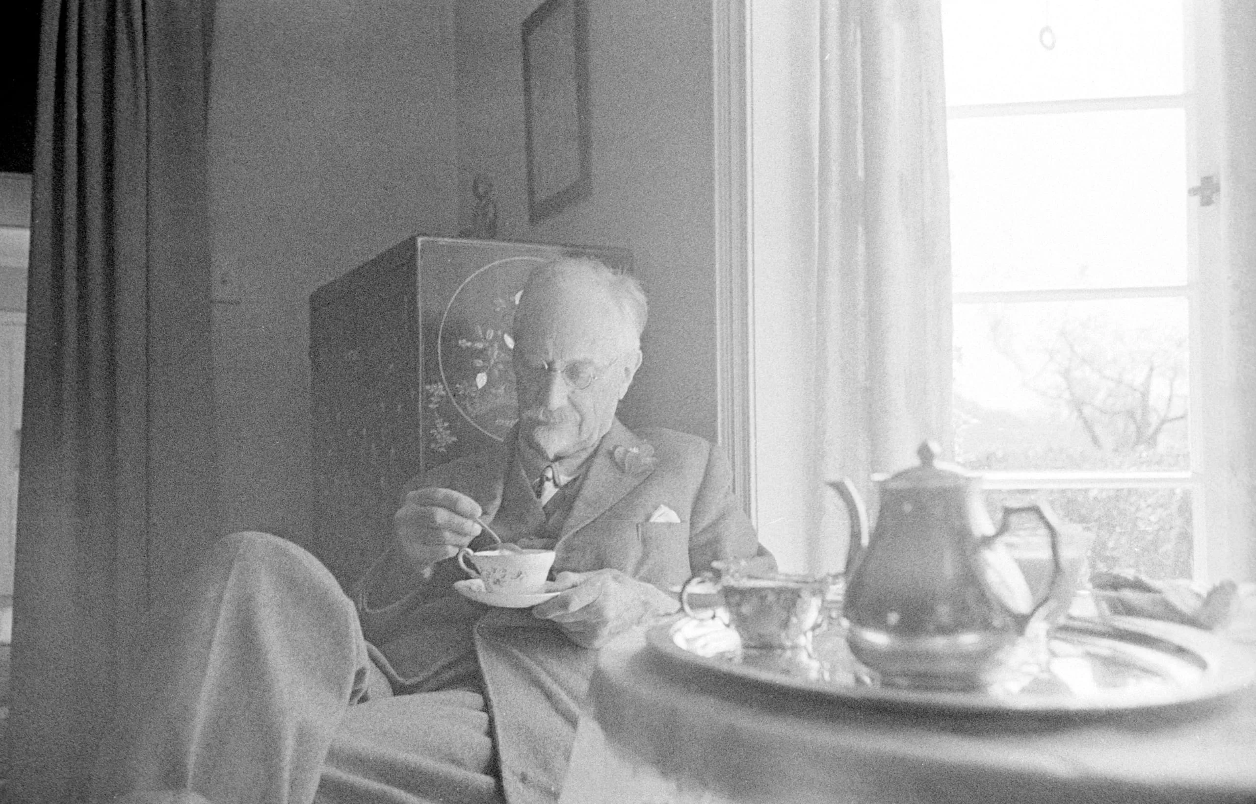 Black and white photograph of an elderly white man in a suit and bow tie, seated indoors, holding a teacup and saucer near a bright window with a silver tea service on a table beside him