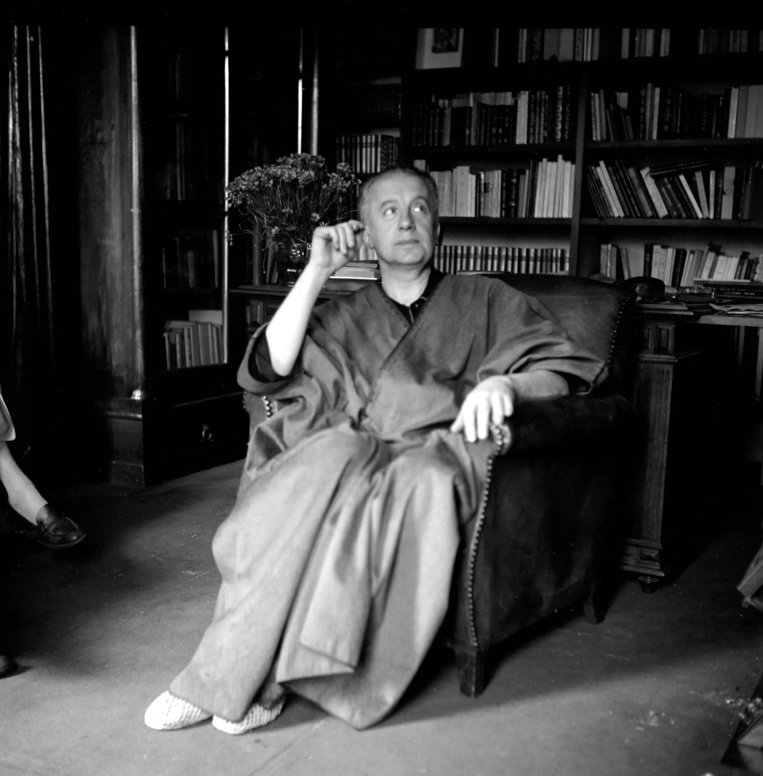 Black and white photograph of a man in a loose robe seated in an armchair, head tilted back, one hand raised near his face, bookshelves behind him