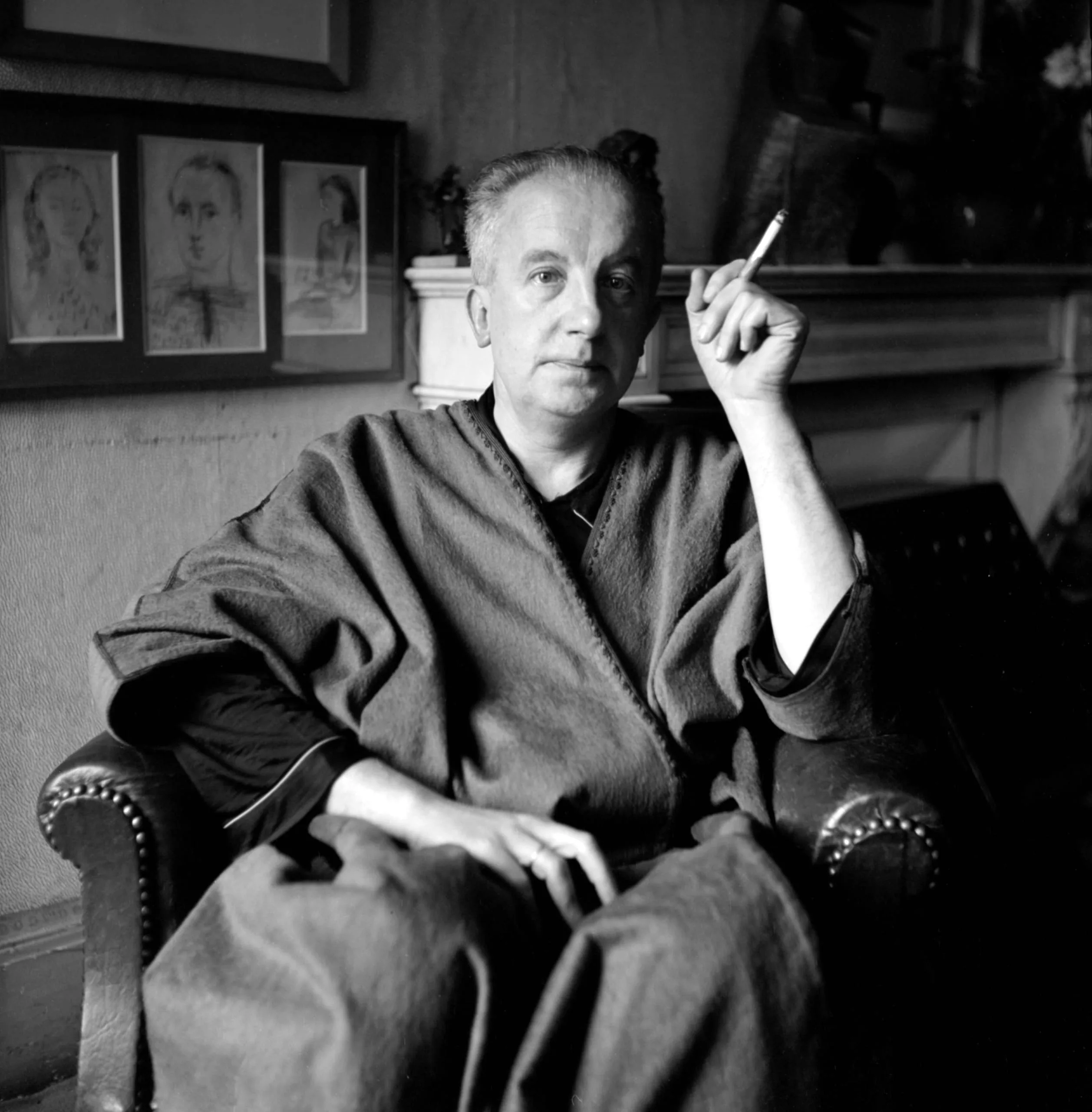 Black and white photograph, a man seated in a leather armchair holding a cigarette aloft, wearing a loose tunic, framed drawings visible on the wall behind him