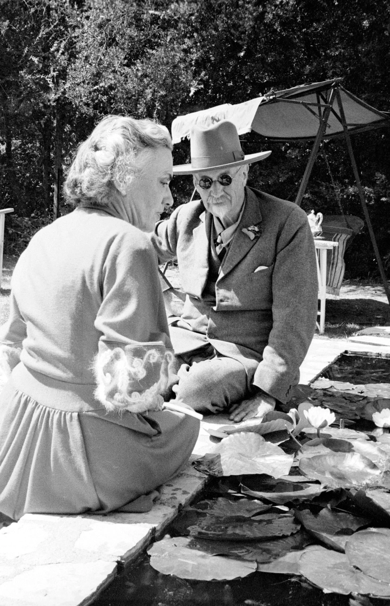Black and white photograph, two elderly figures seated outdoors beside a lily pond, woman seen from behind, man in wide-brimmed hat and dark glasses