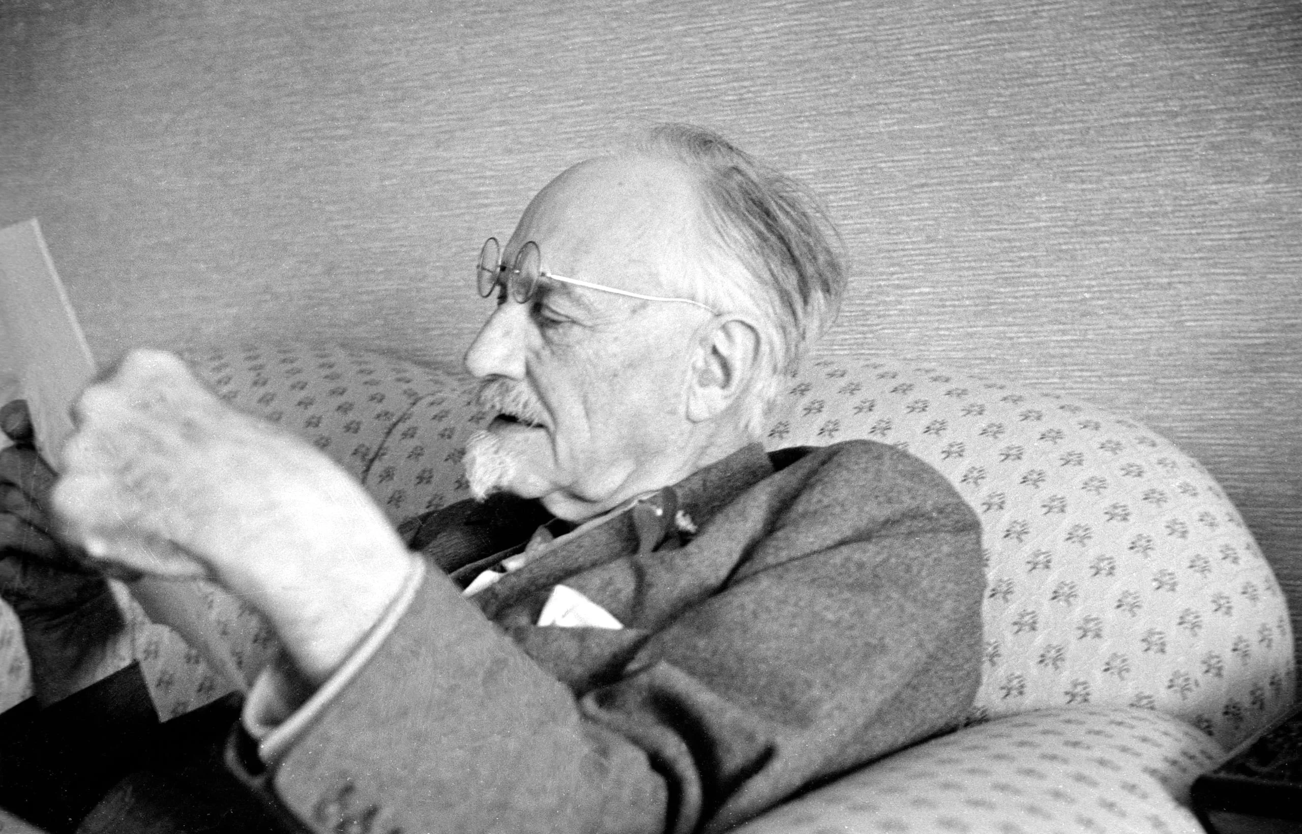 Black and white photograph of an elderly white man in profile, reclining against a patterned pillow and reading a small card, wearing round wire-rimmed glasses and a dark jacket