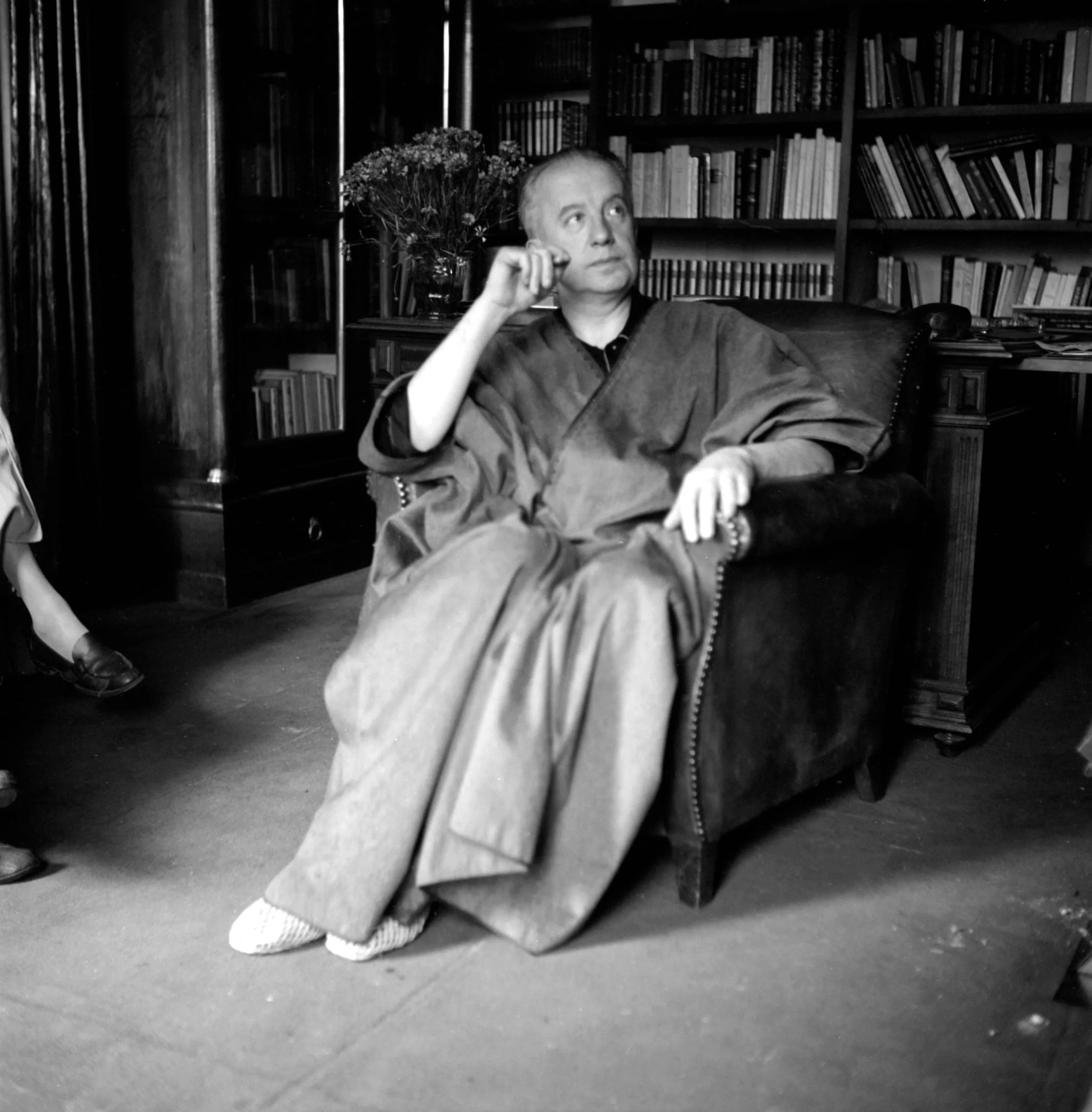 Black and white photograph of a man in a long, loose robe seated in a dark armchair, head tilted back, hand raised near his cheek, bookshelves visible behind him