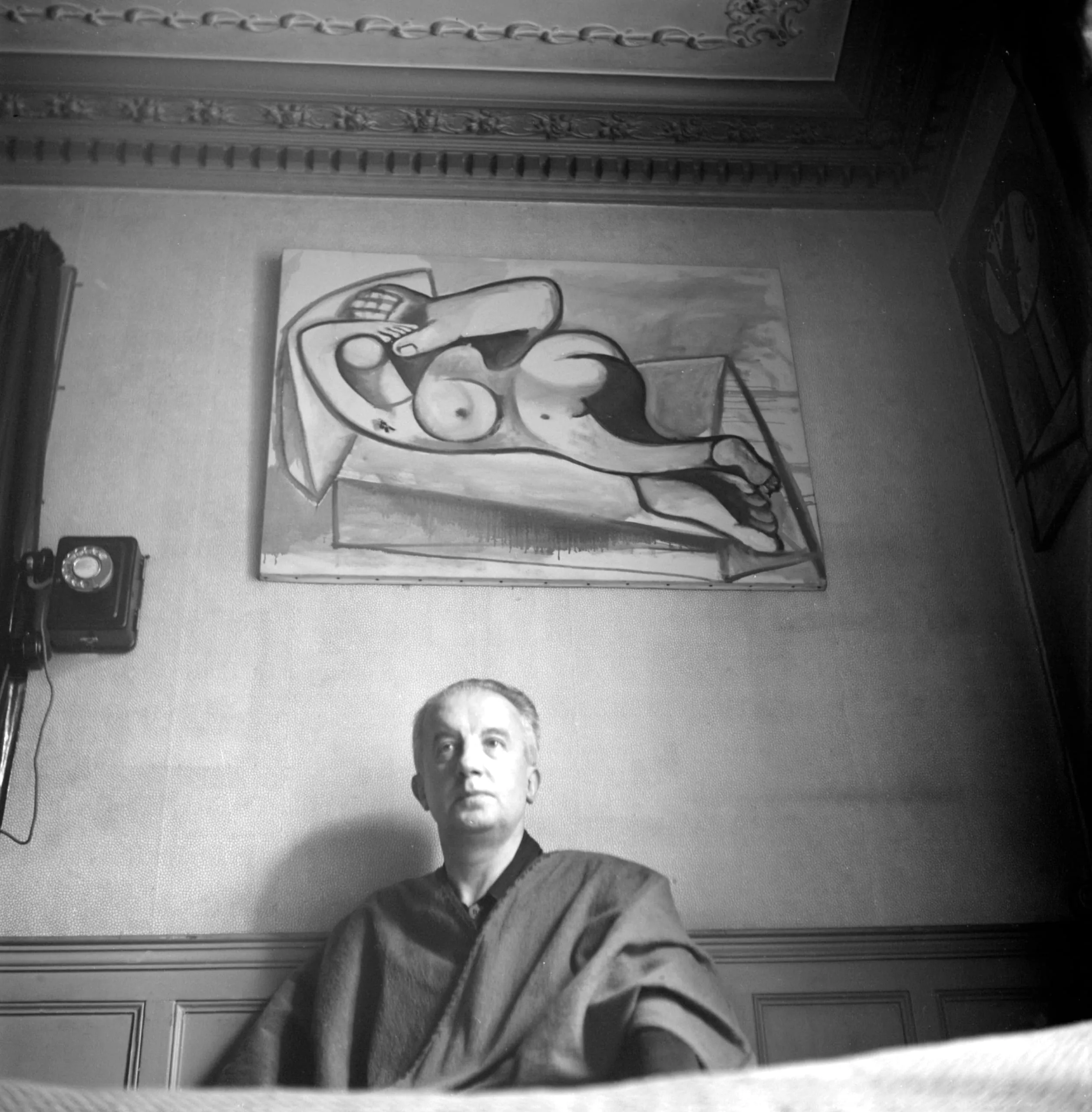 Black and white photograph of a man seated beneath a large Cubist-style nude painting, in a room with ornate ceiling molding and a wall-mounted rotary telephone