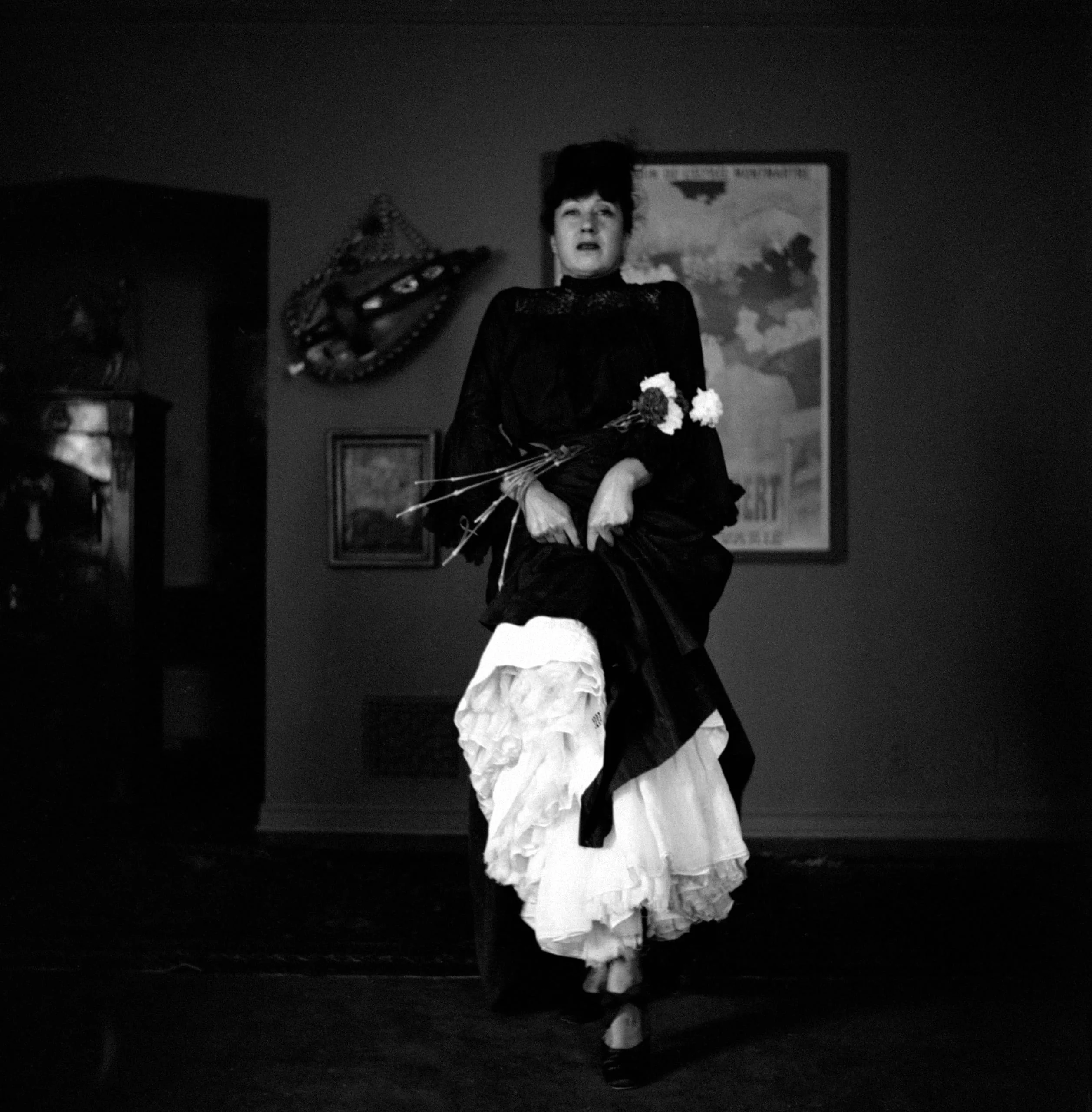 Black and white photograph, full-length portrait of a woman mid-stride in a dark fitted bodice and voluminous ruffled white skirt, holding a bouquet of white flowers, interior setting with framed poster on wall behind her
