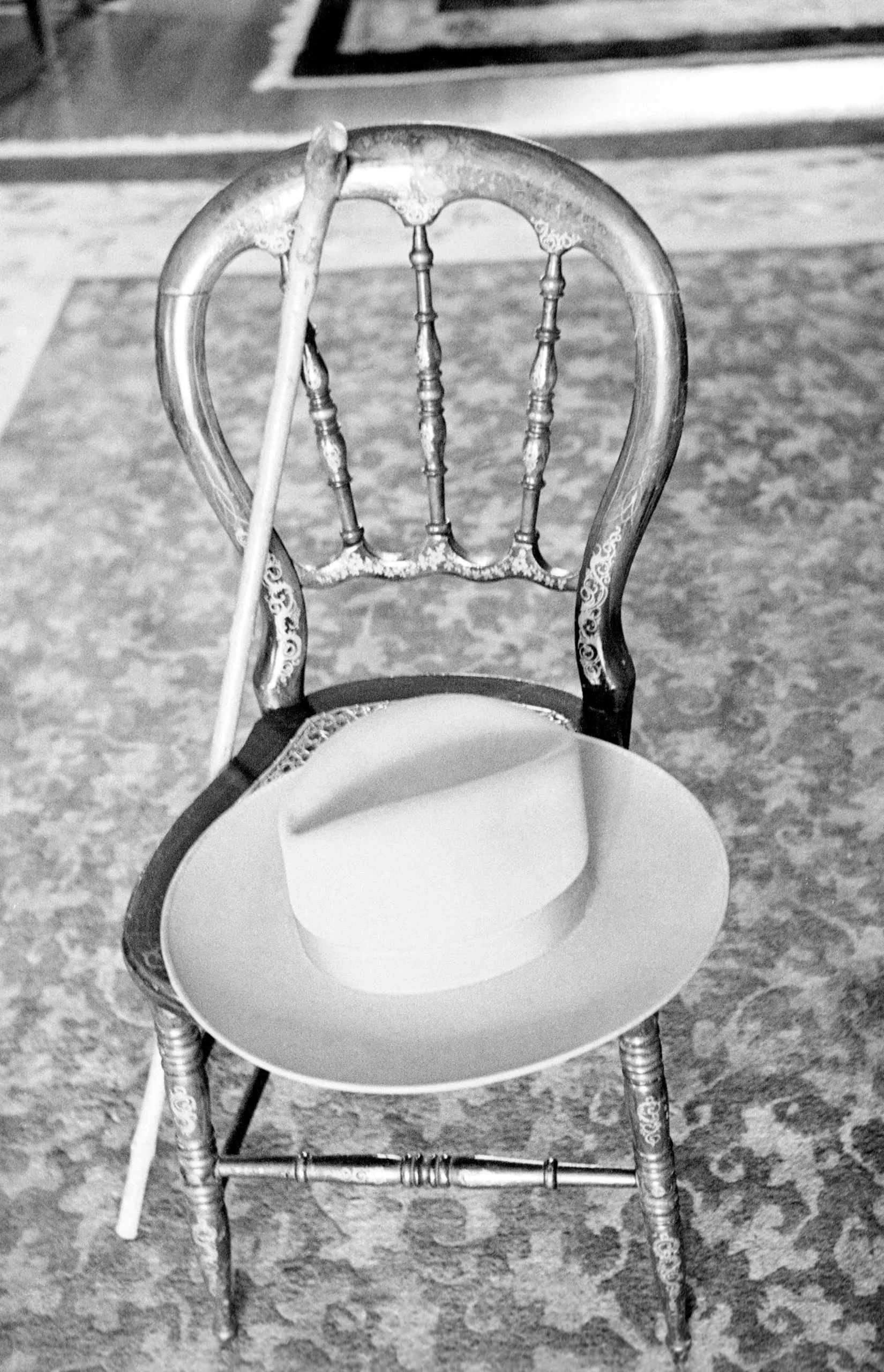 Black and white photograph looking down onto an ornate spindle-back chair on a patterned rug, a pale wide-brimmed hat resting on the seat and a cane leaning against the back