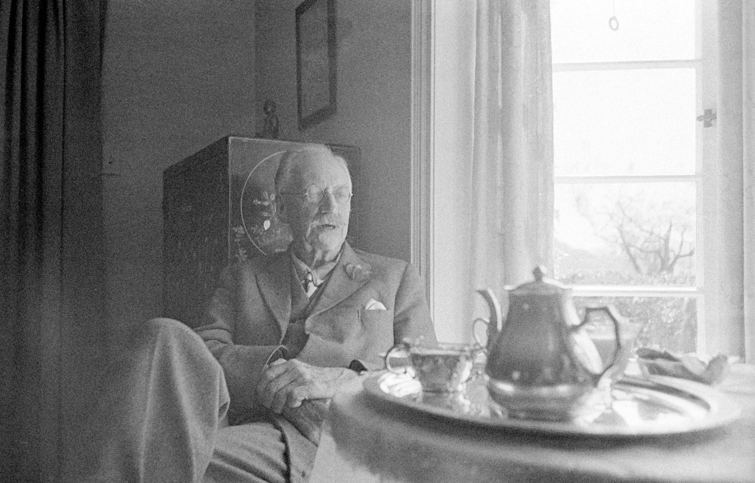 Black and white photograph of an elderly man in a suit seated in a chair beside a bright window, with a silver tea service on a tray in the foreground