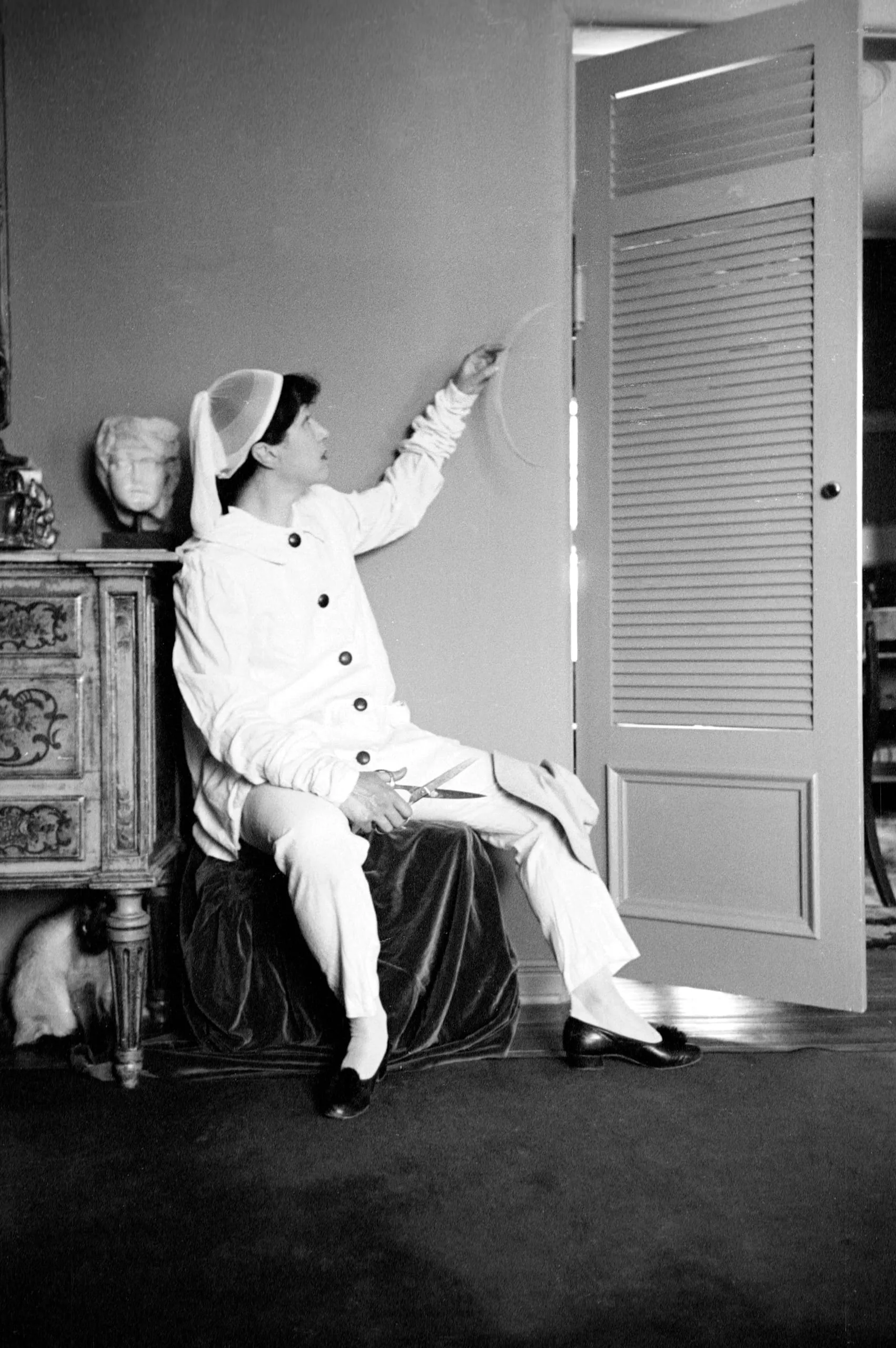Black and white photograph, full-length view of a figure in a white Pierrot costume seated on a dark ottoman, arm raised toward the wall, scissors in lap