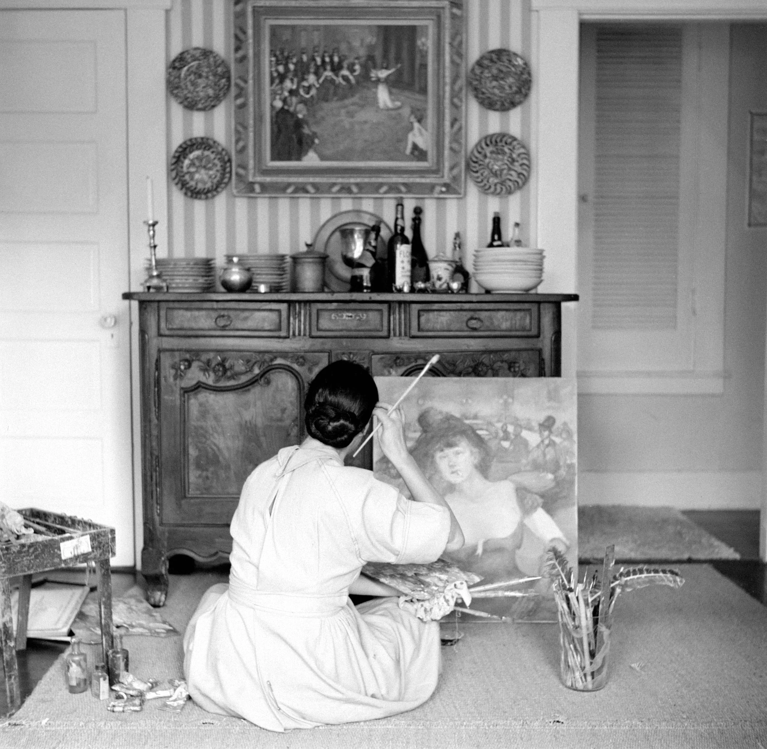 Black and white photograph of a woman seated on the floor, back to the camera, painting a large figurative canvas in a furnished room