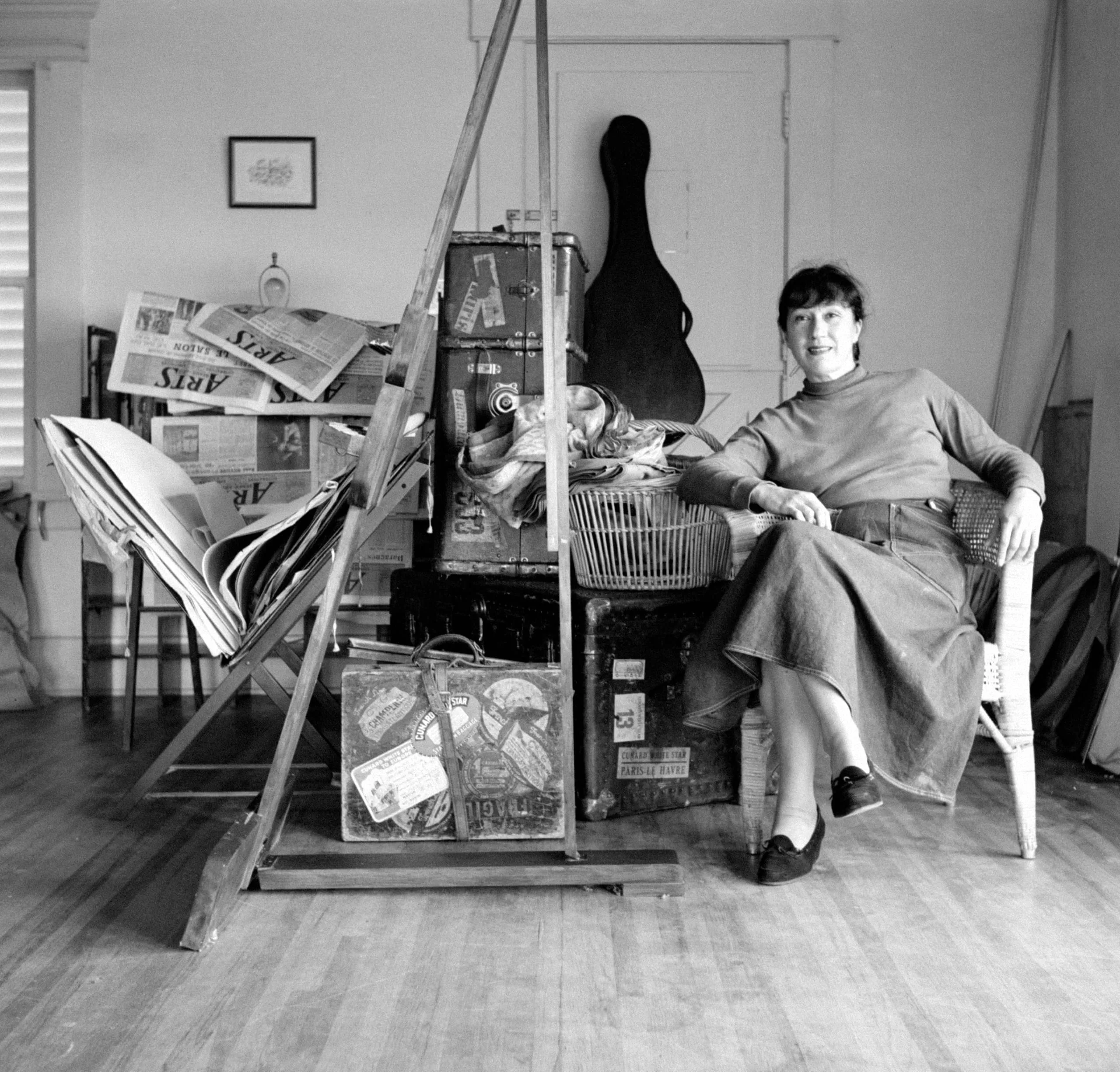 Black and white photograph of a white woman with short dark hair seated in a wicker chair surrounded by stacked vintage suitcases, an easel stacked with newspapers, and a string instrument case
