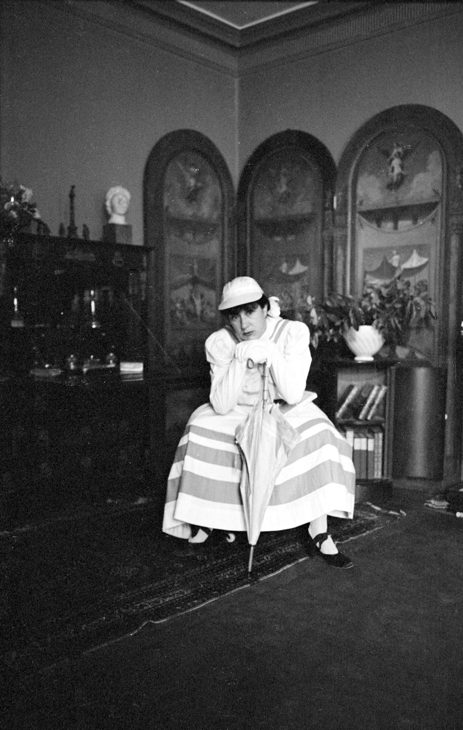 Black and white photograph of a woman seated in an interior, wearing a wide striped skirt, puffed-sleeve blouse, and rounded hat, chin resting on hand, holding a closed umbrella