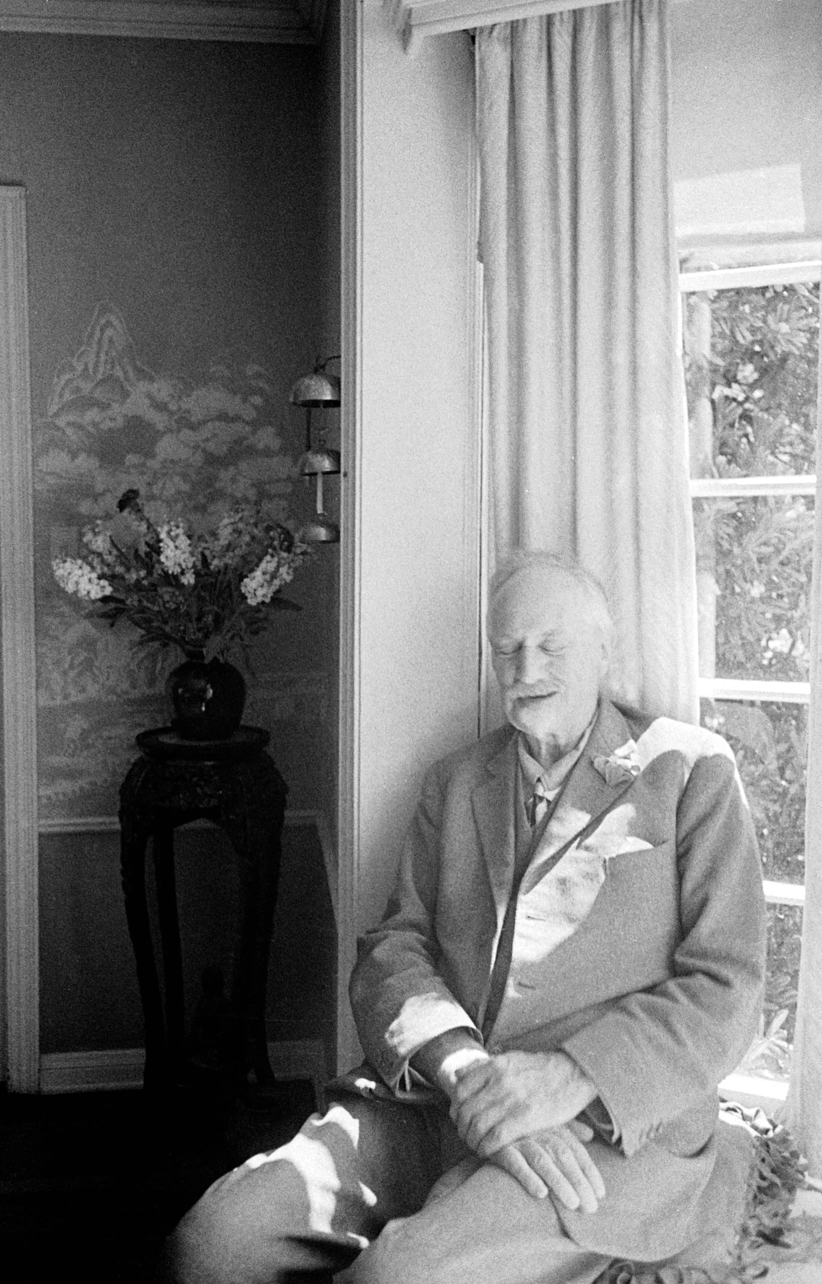 Black and white photograph of an elderly white man in a suit seated near a curtained window, hands folded, chin tilted down, with a floral arrangement visible in a doorway behind him