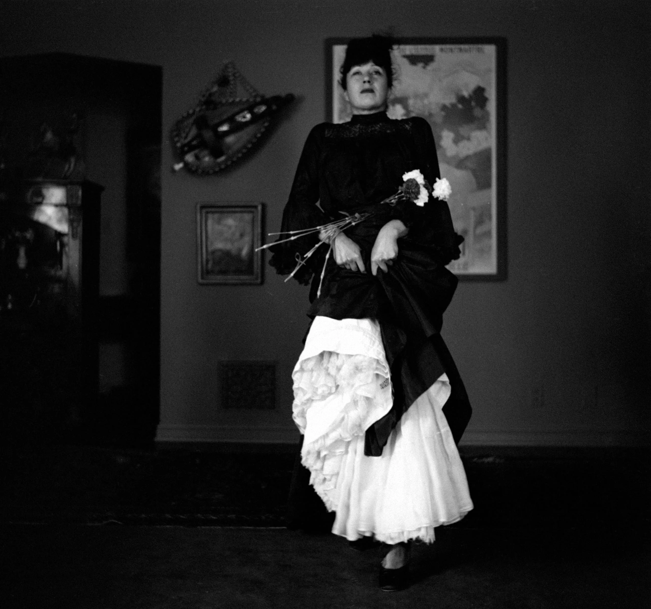 Black and white photograph of a woman in a Victorian-style black bodice and ruffled white skirt, head tilted back, holding a bouquet of carnations in an interior room