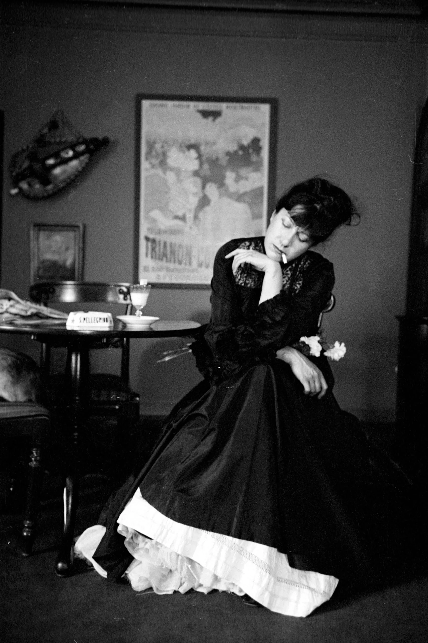 Black and white photograph of a white woman in a full-length dark Victorian gown seated with head bowed, hand raised to her chin, white petticoat visible at the hem; a poster reading 'TRIANON' hangs on the wall behind her