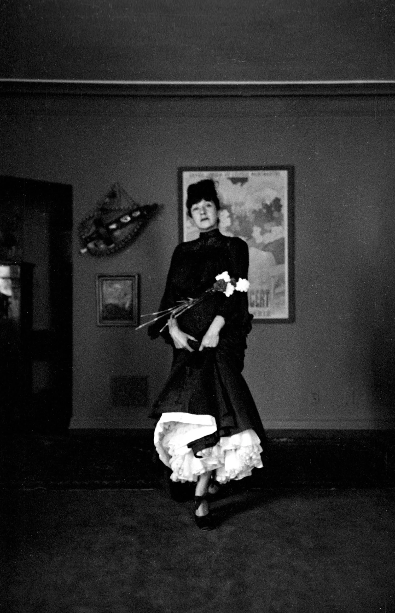 Black and white photograph of a woman in a dark Victorian-style dress with white ruffled petticoats, holding white flowers, standing in a dim interior room