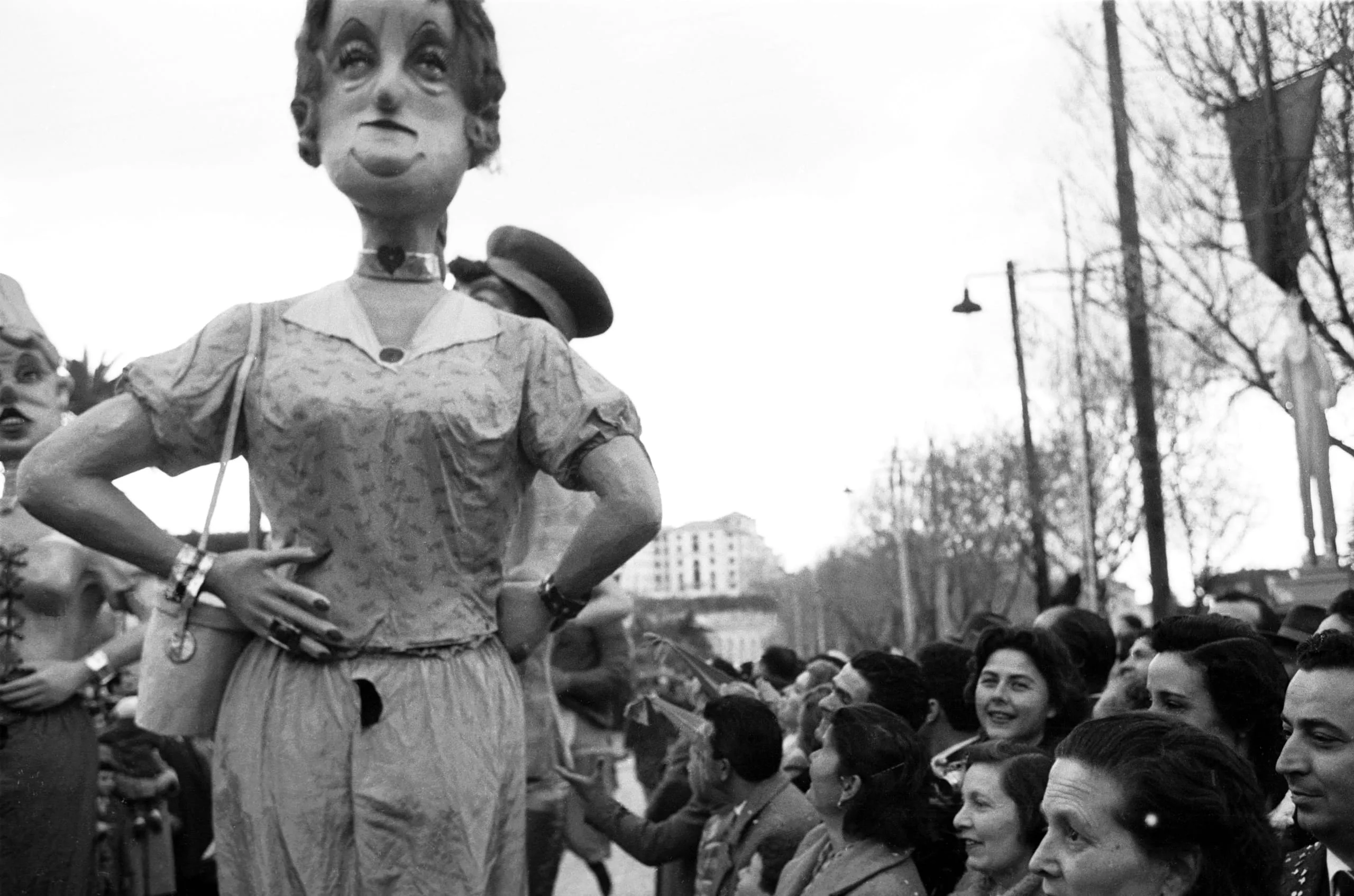 Black and white photograph of two oversized parade figures, or gigantes, towering above a densely packed outdoor crowd in mid-twentieth century dress