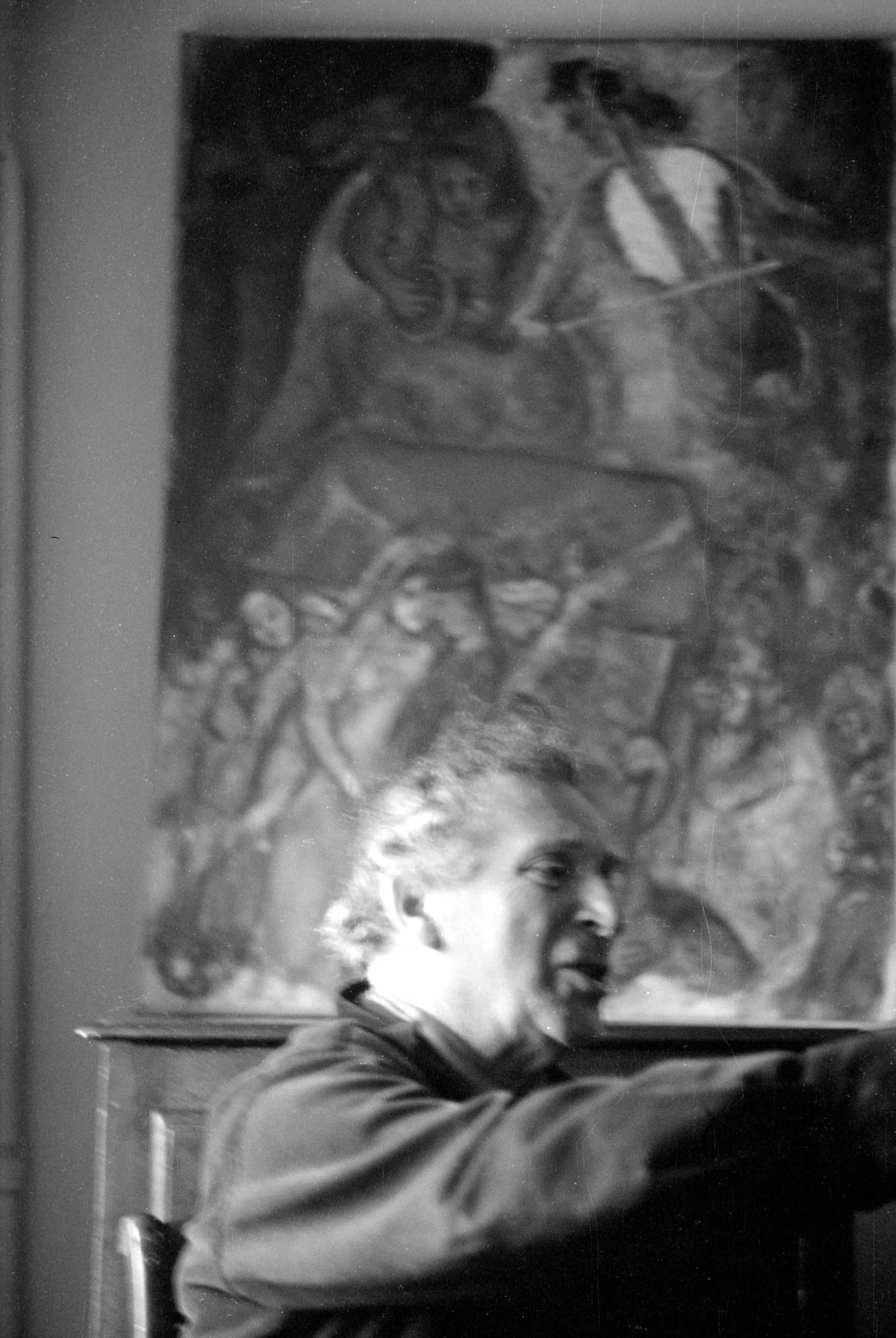 Black and white photograph of a man seated in front of a large figurative painting, dramatically lit from the left with soft focus throughout