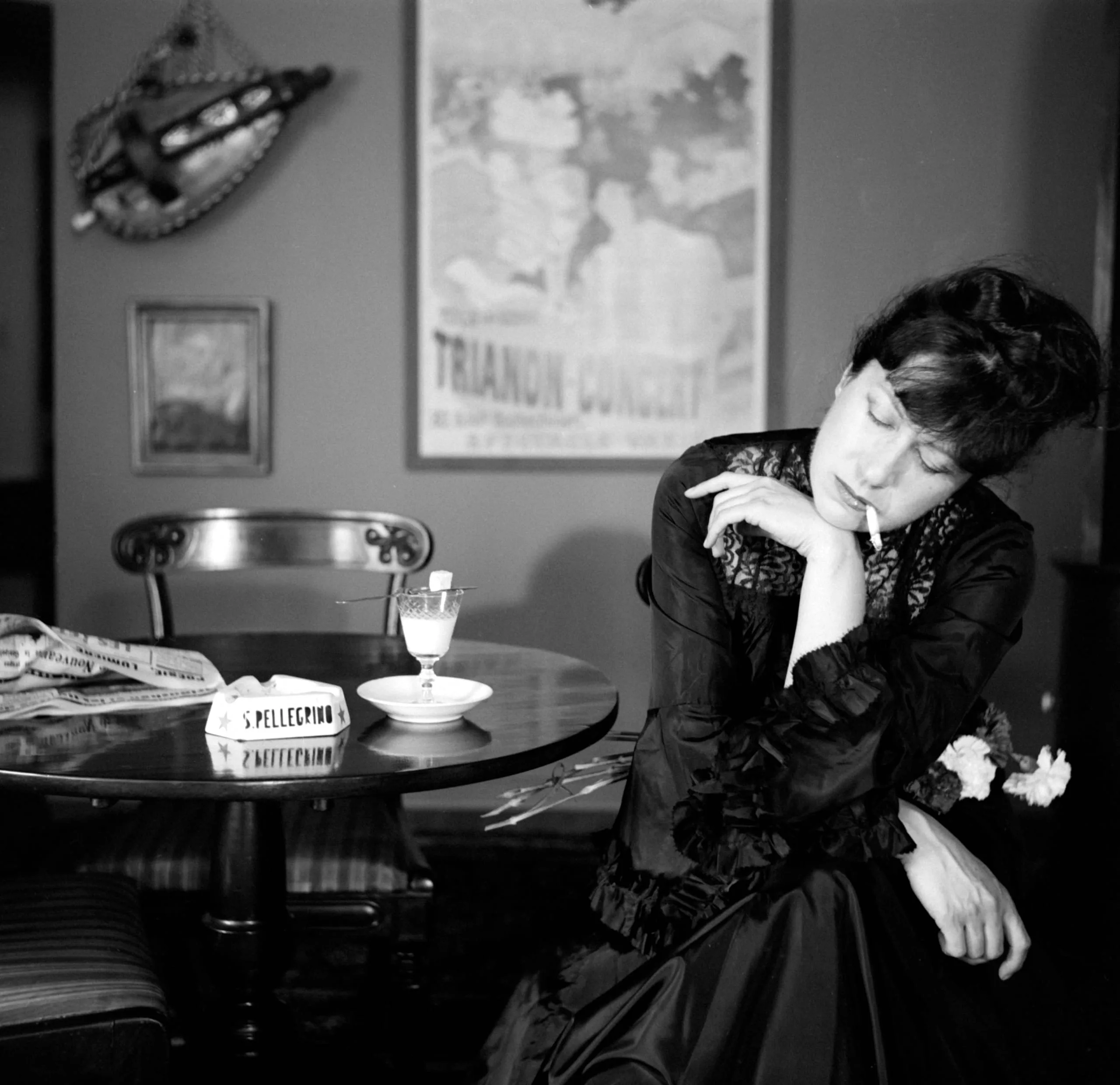 Black and white photograph of a woman in a dark lace-trimmed dress seated at a café table, chin resting on her hand holding a cigarette, with a "Trianon Concert" poster on the wall behind her