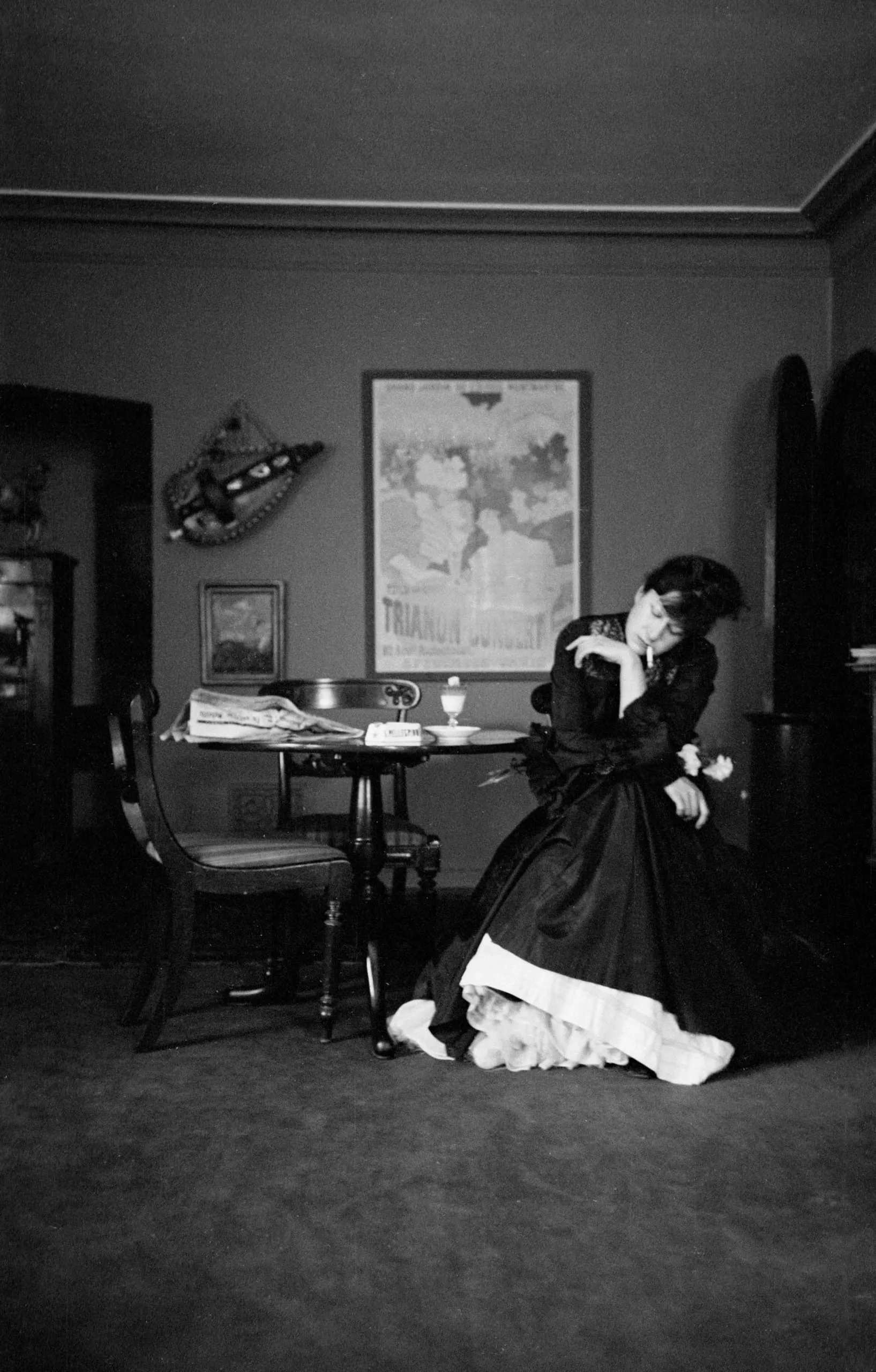 Black and white photograph of a woman in a full dark Victorian gown seated on a bare floor, leaning forward with chin resting on hand, interior room with framed poster on wall behind her