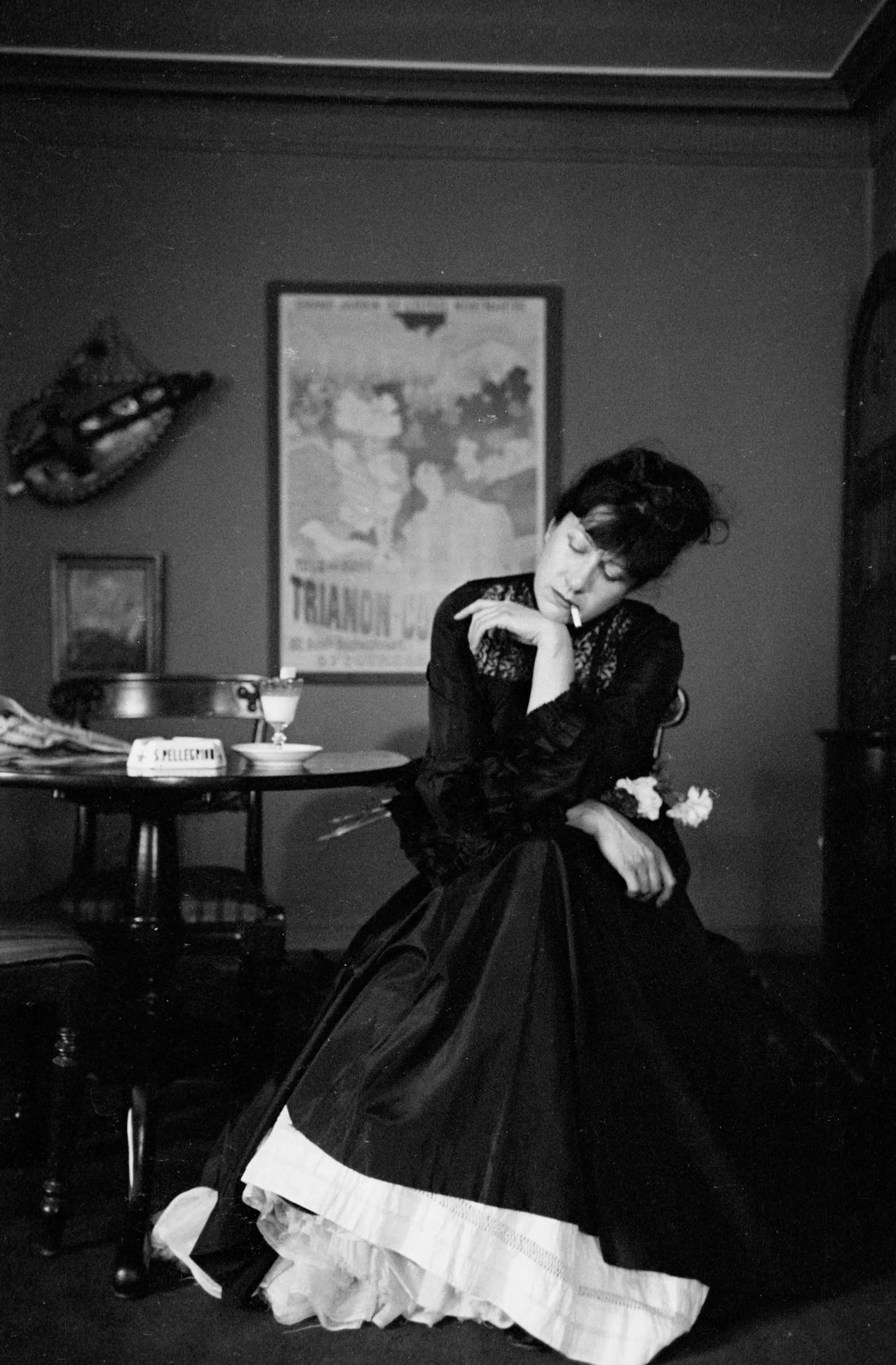 Black and white photograph of a woman in a Victorian-style dark dress with white ruffled hem, seated beside a round table in an interior with a 'Trianon' poster on the wall behind her