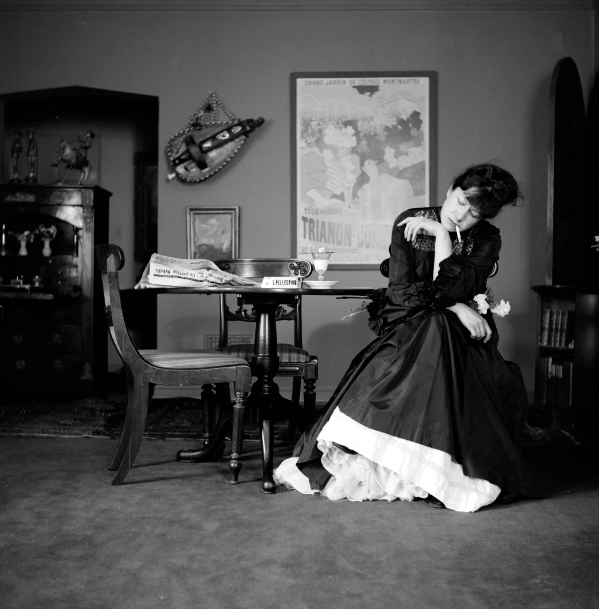 Black and white photograph of a woman in a Victorian-style dark dress with white ruffled hem, seated at a round table in a furnished interior, holding a cigarette to her lips