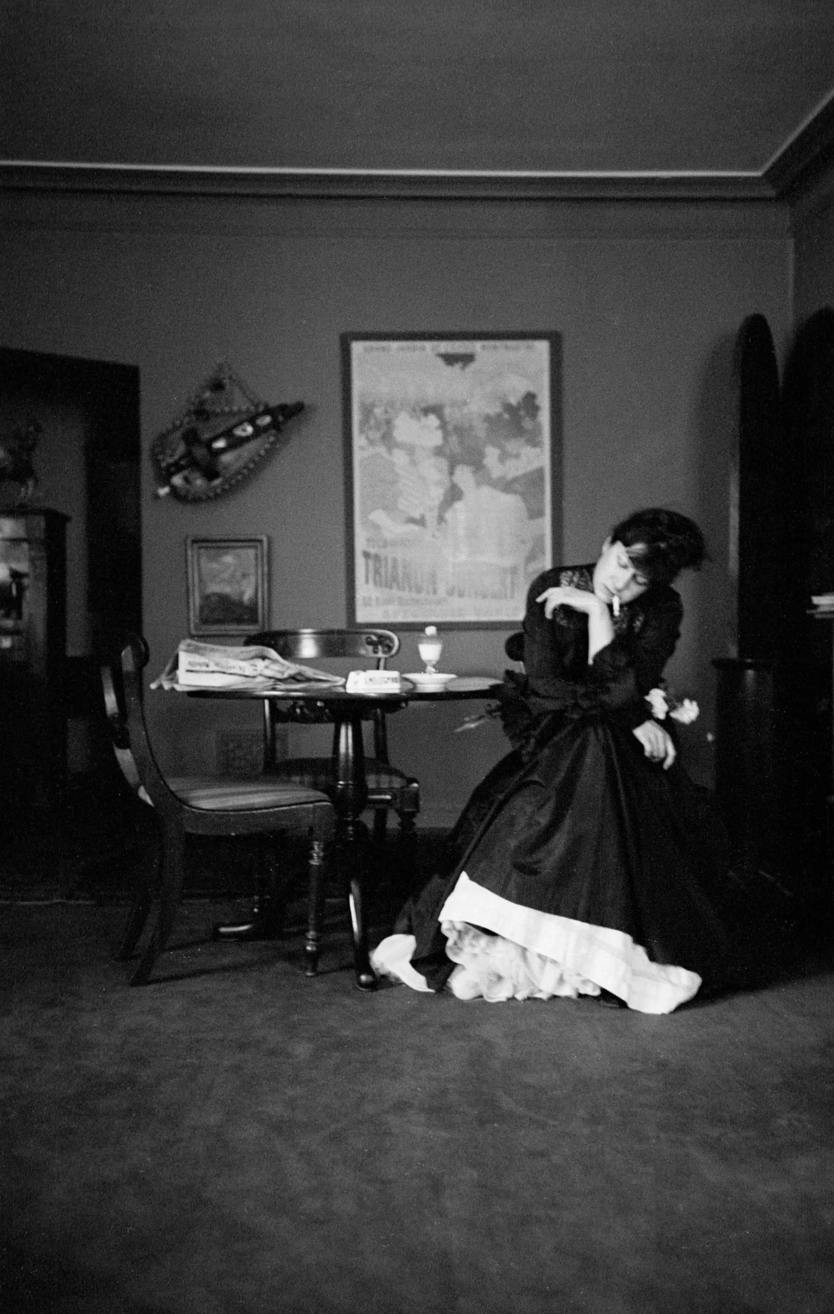 Black and white photograph of a woman in a dark Victorian gown seated beside a round café table in a room with a French poster on the wall