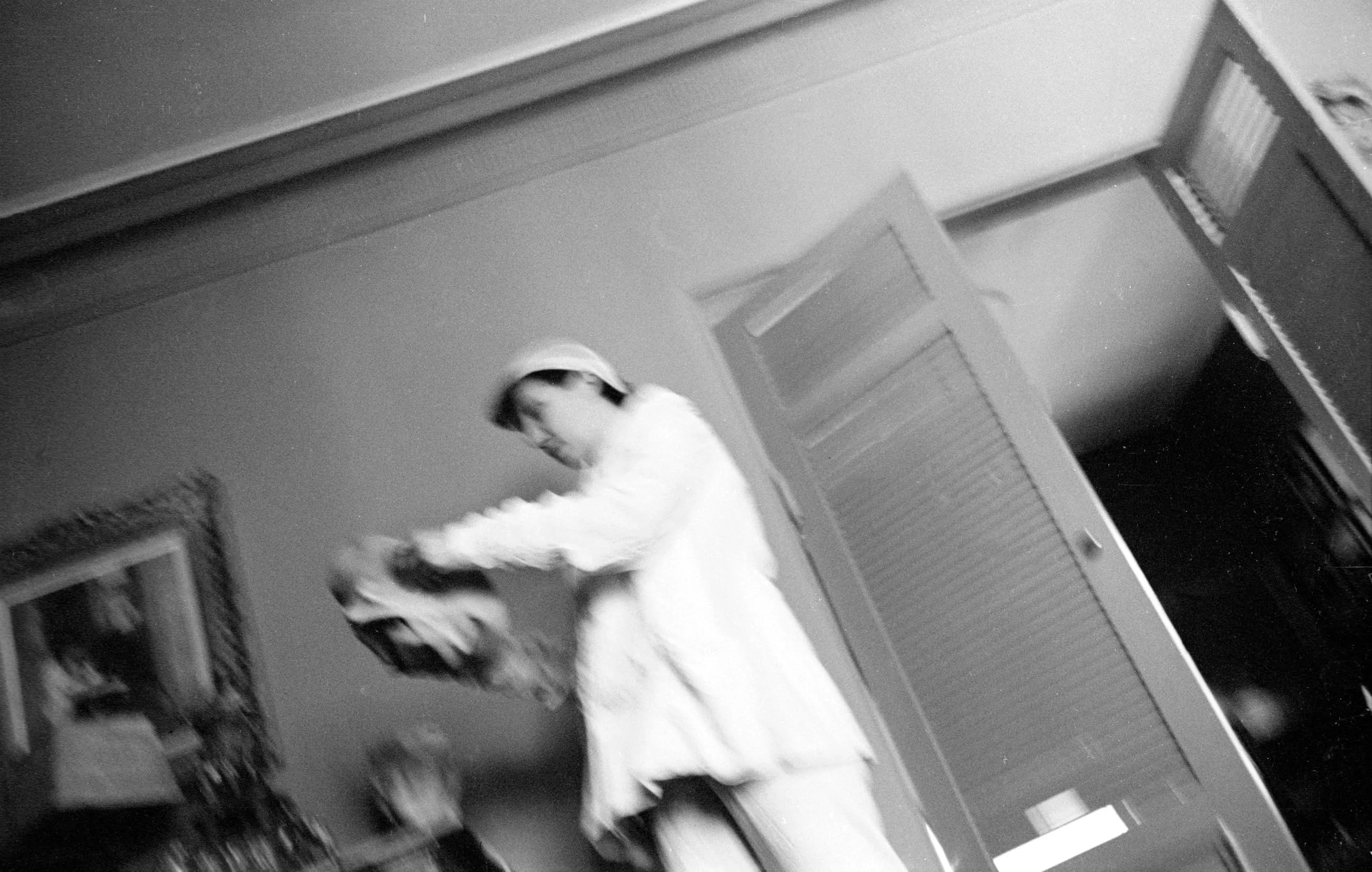 Blurred black and white photograph of a figure in a white uniform and cap, arms extended, inside a tilted interior with a louvered door