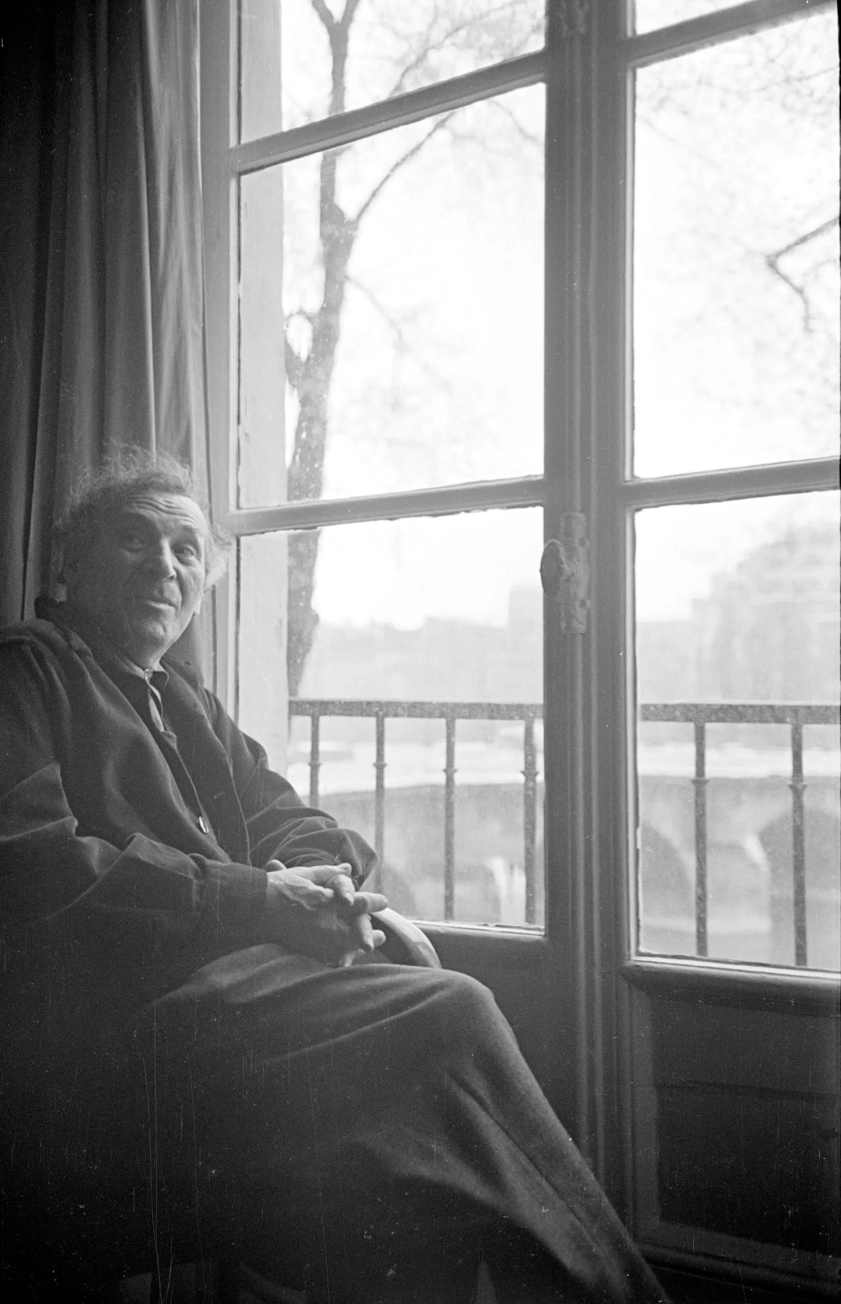 Black and white photograph of a middle-aged man seated beside a multi-paned window, body angled left, hands clasped in lap, bare trees visible outside