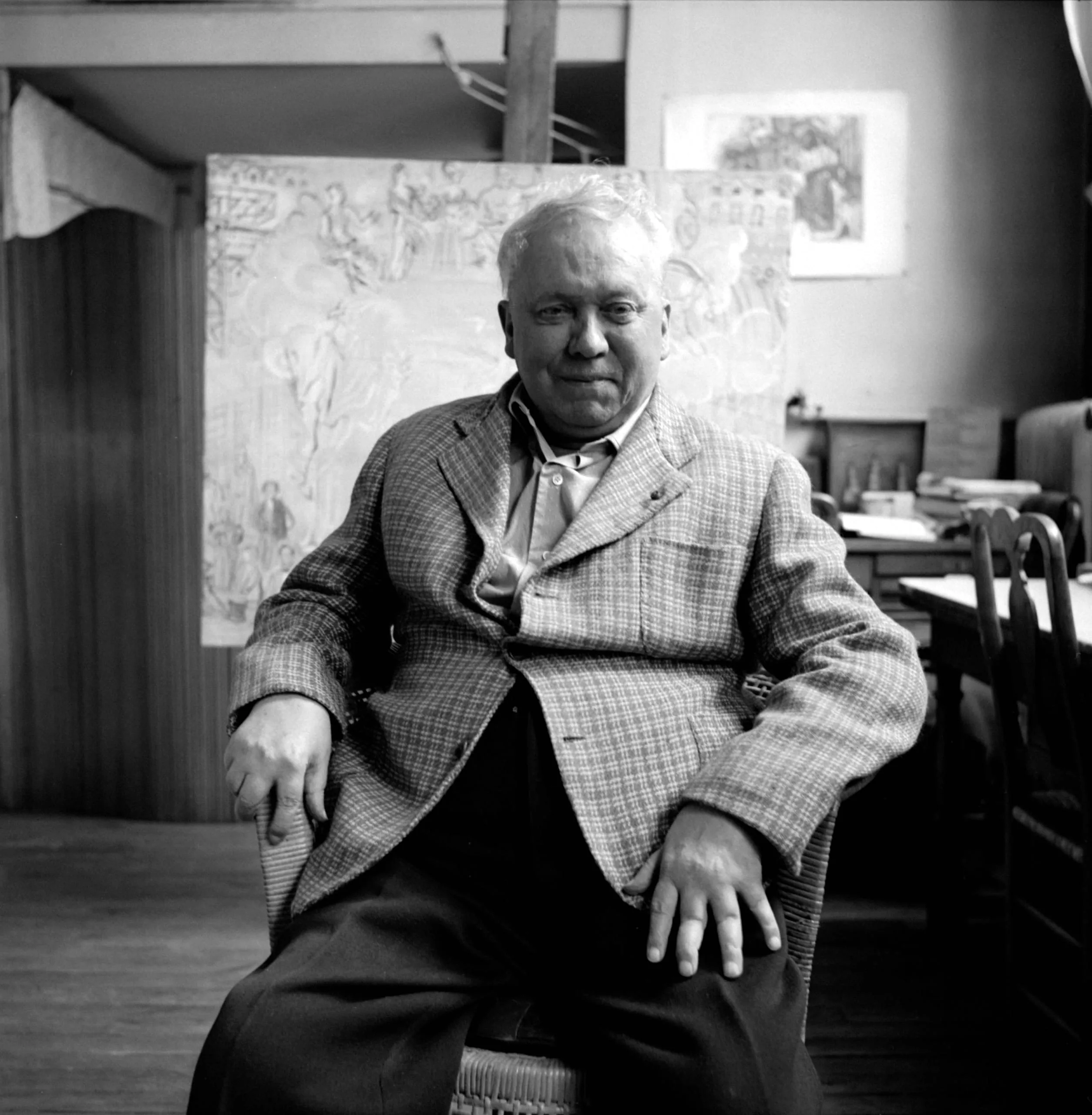 Black and white photograph of a heavyset white man with white hair seated in a caned chair, facing the camera, wearing a plaid sport coat, with a large figural sketch visible on the wall behind him