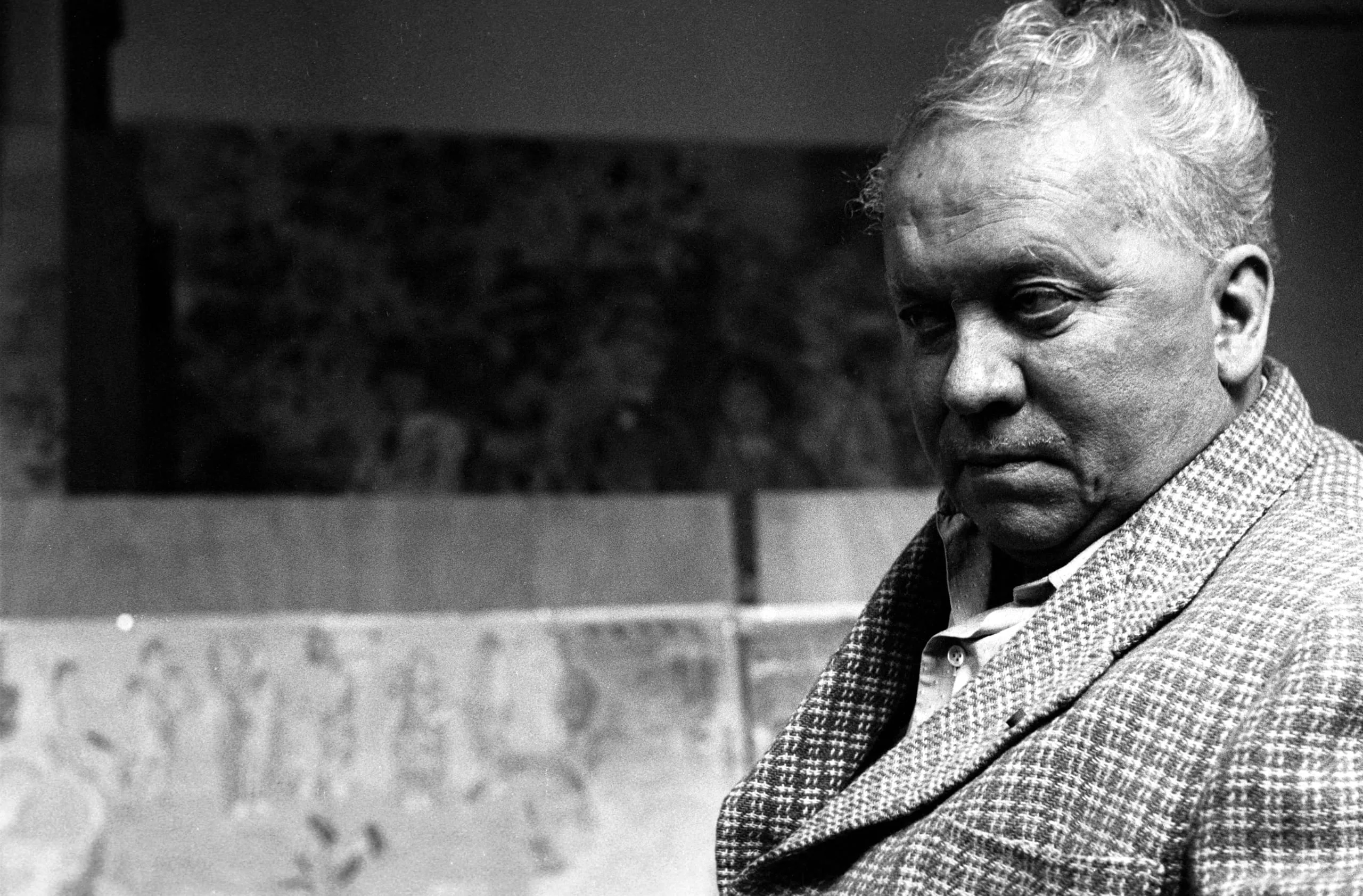 Black and white portrait photograph, heavyset man in houndstooth jacket, three-quarter profile with gaze cast downward, large canvases visible behind him