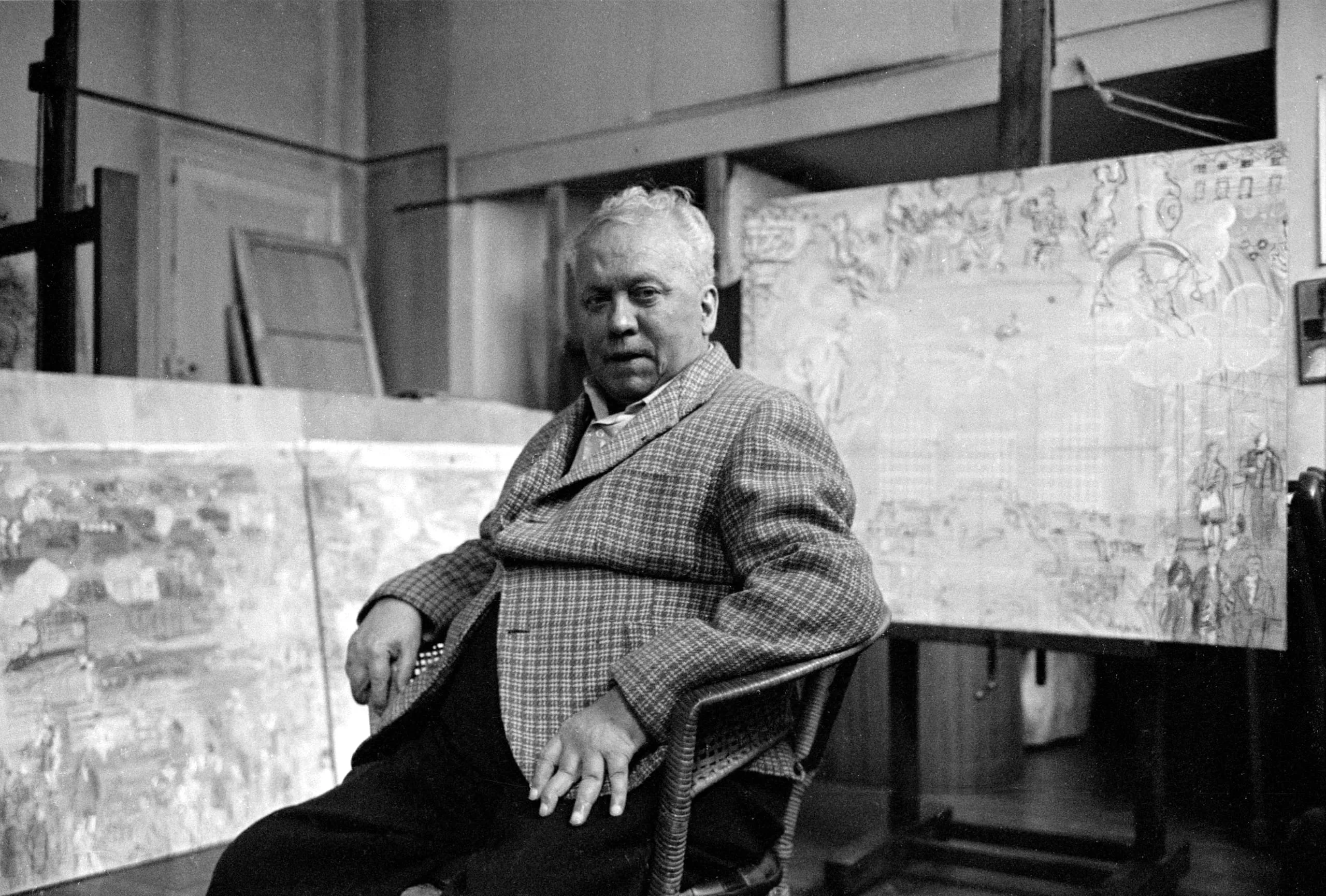 Black and white photograph of a heavyset Black man seated in a wooden chair in an artist's studio, surrounded by large canvases, wearing a plaid sport coat