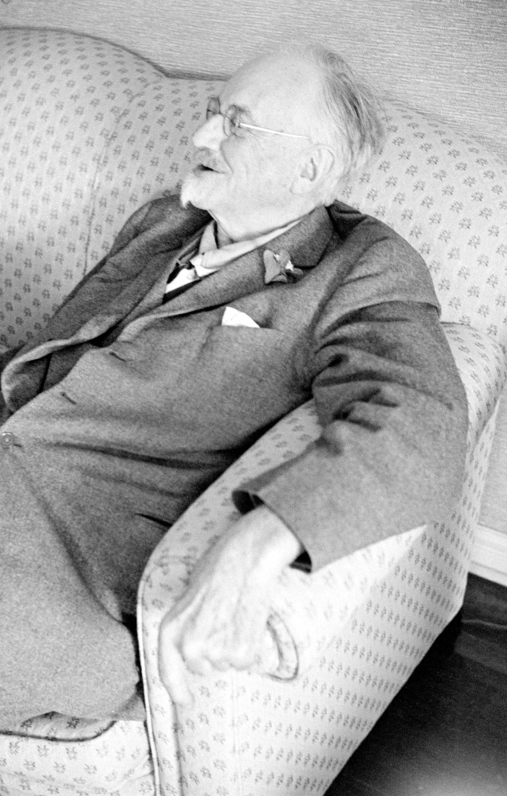 Black and white photograph of an elderly man in a suit jacket reclining on a patterned sofa, head tilted back, wire-rimmed glasses low on his nose