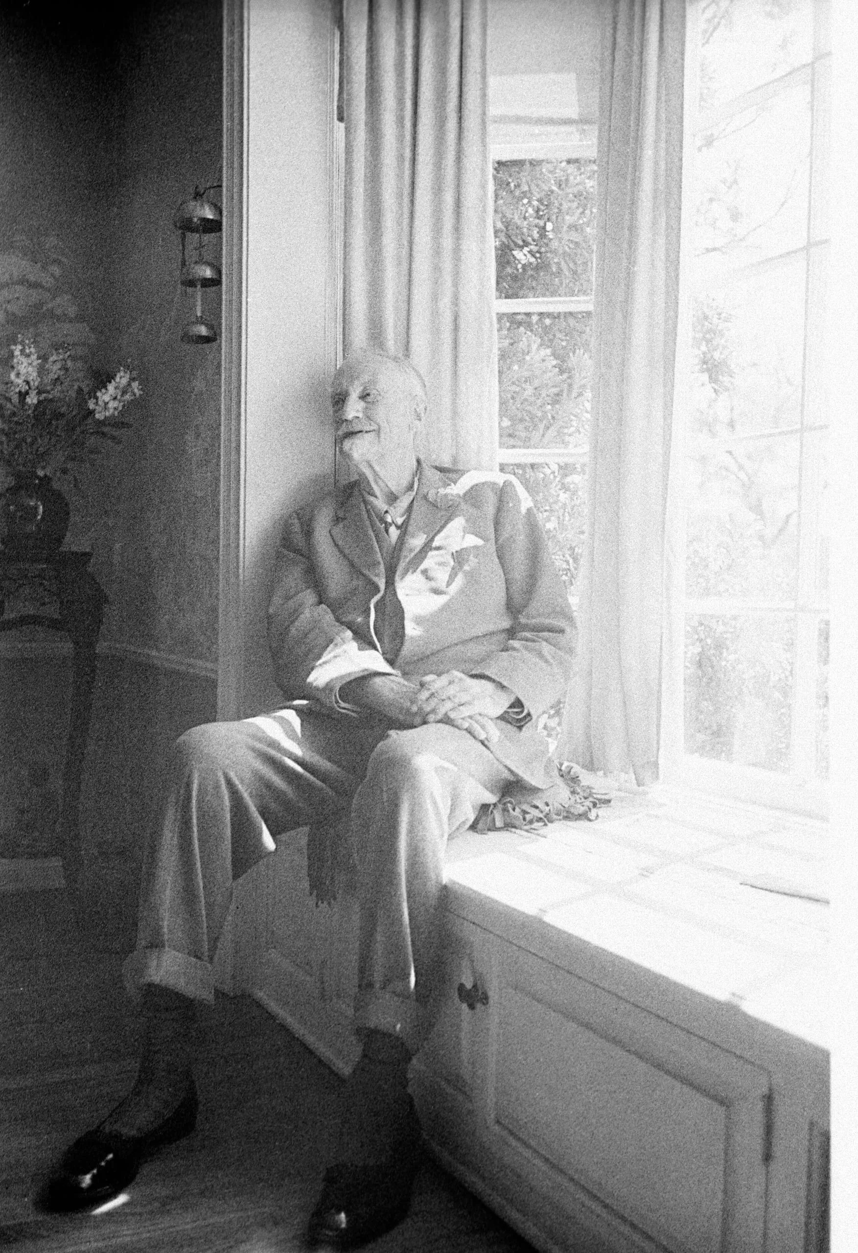 Black and white photograph of an elderly man seated on a window bench, head tilted back, hands clasped in lap, backlit by bright natural light