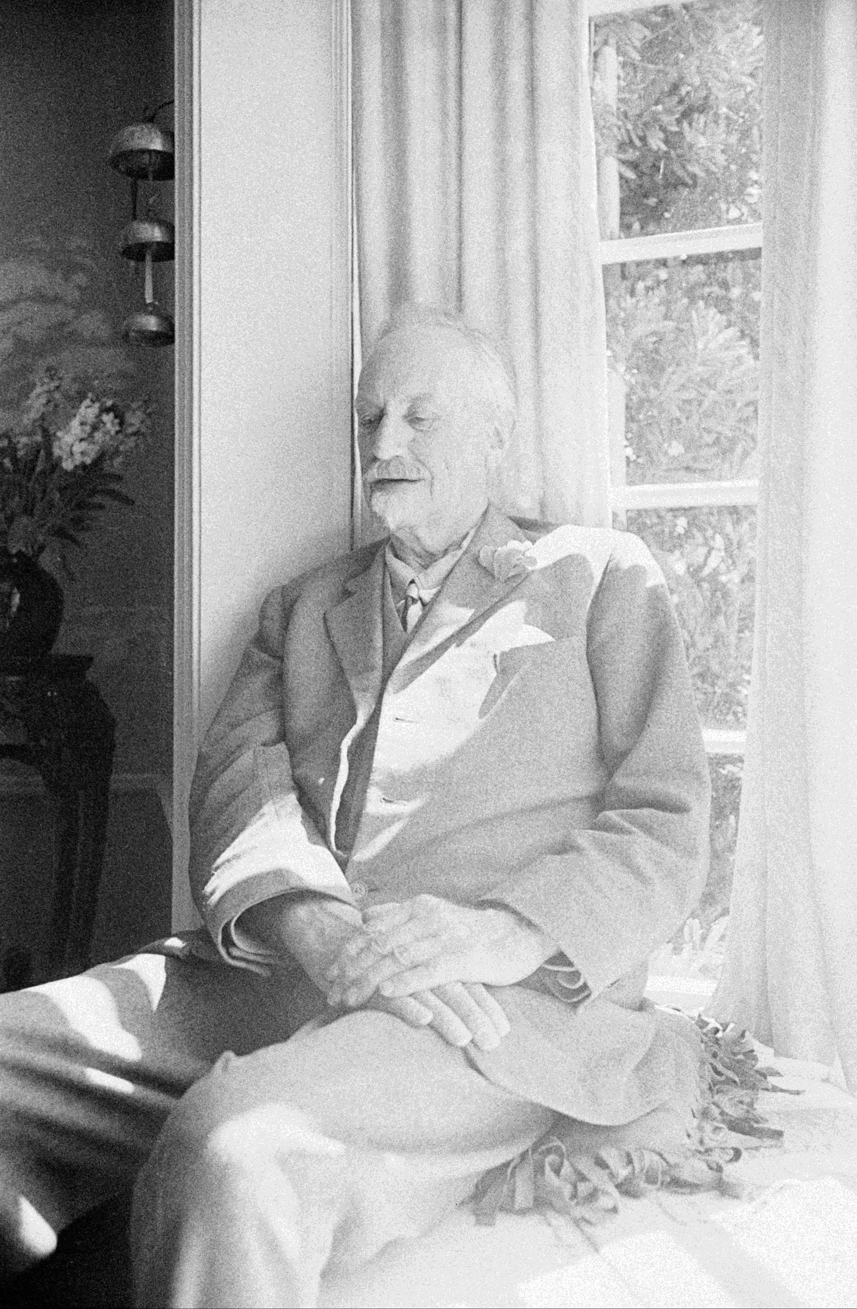 Black and white photograph of an elderly white man seated near a sunlit window, hands folded in lap, wearing a suit with a boutonniere