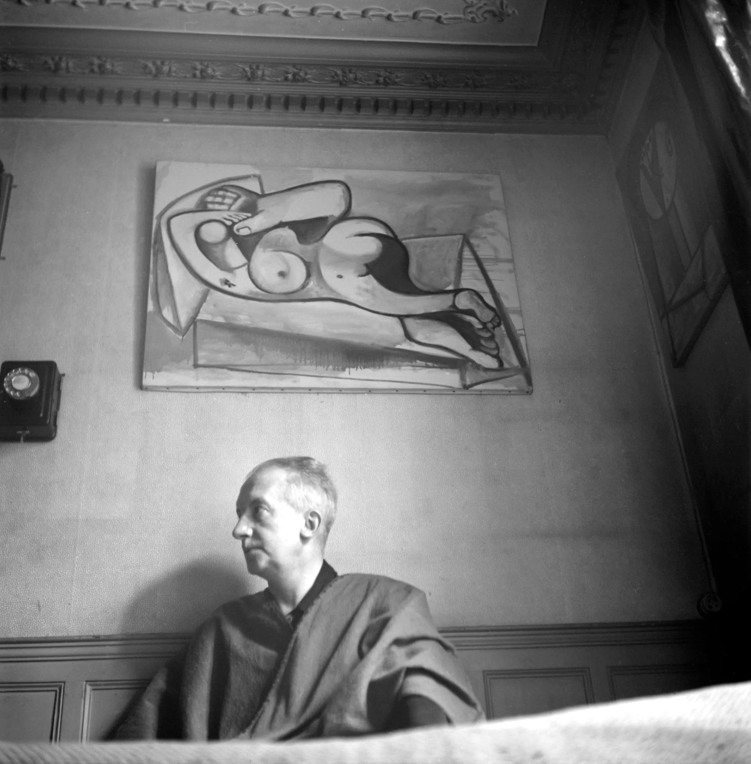 Black and white photograph of a man in left profile seated beneath a large cubist-style painting of a reclining nude in an ornate interior