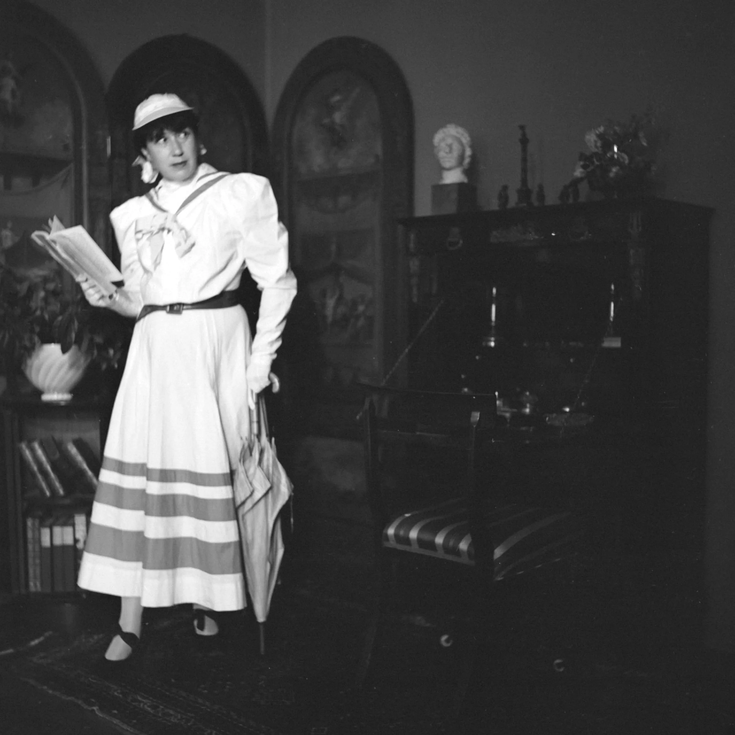 Black and white photograph, full-length view of a woman in a white sailor-collared blouse, striped skirt, and flat hat, holding papers and an umbrella in a furnished interior