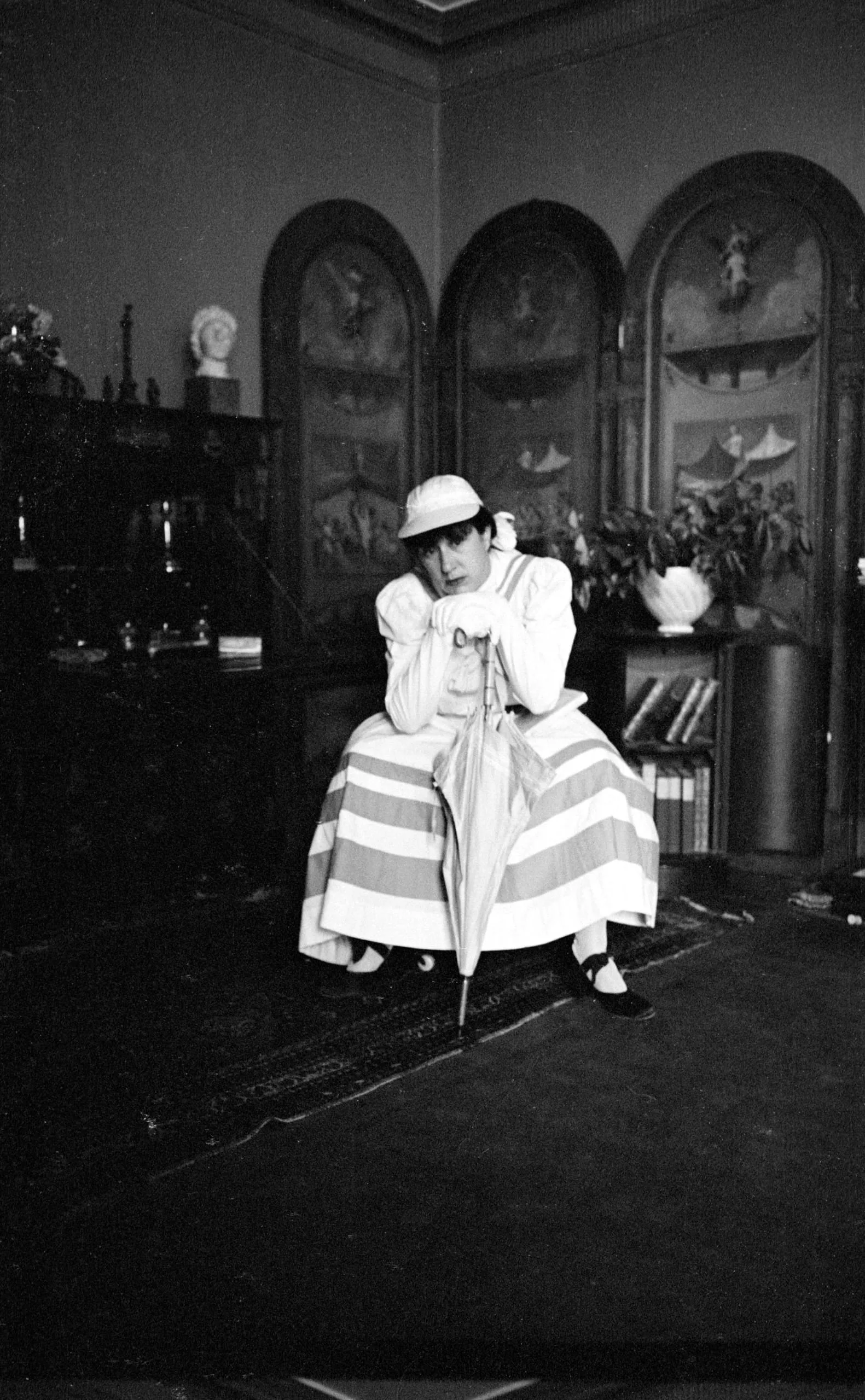 Black and white photograph of a woman in a striped skirt and wide-brimmed hat seated in an interior room, leaning forward with both hands gripping a striped umbrella