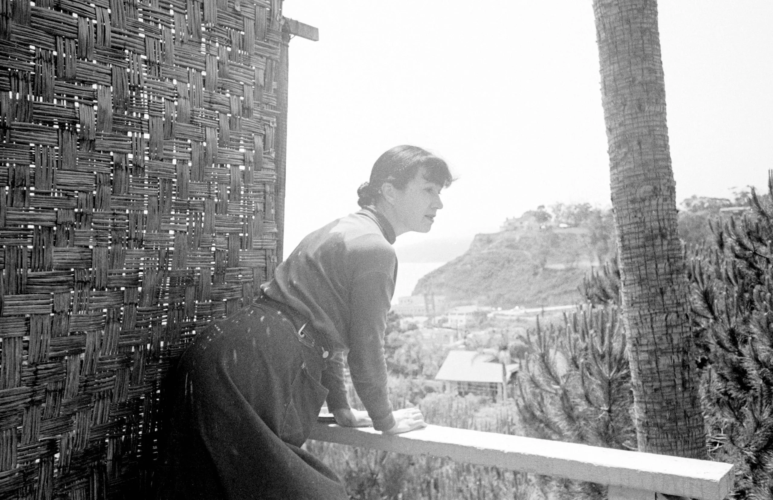 Black and white photograph of a young woman with short dark hair leaning on a balcony railing in profile, with a coastal hillside visible in the distance