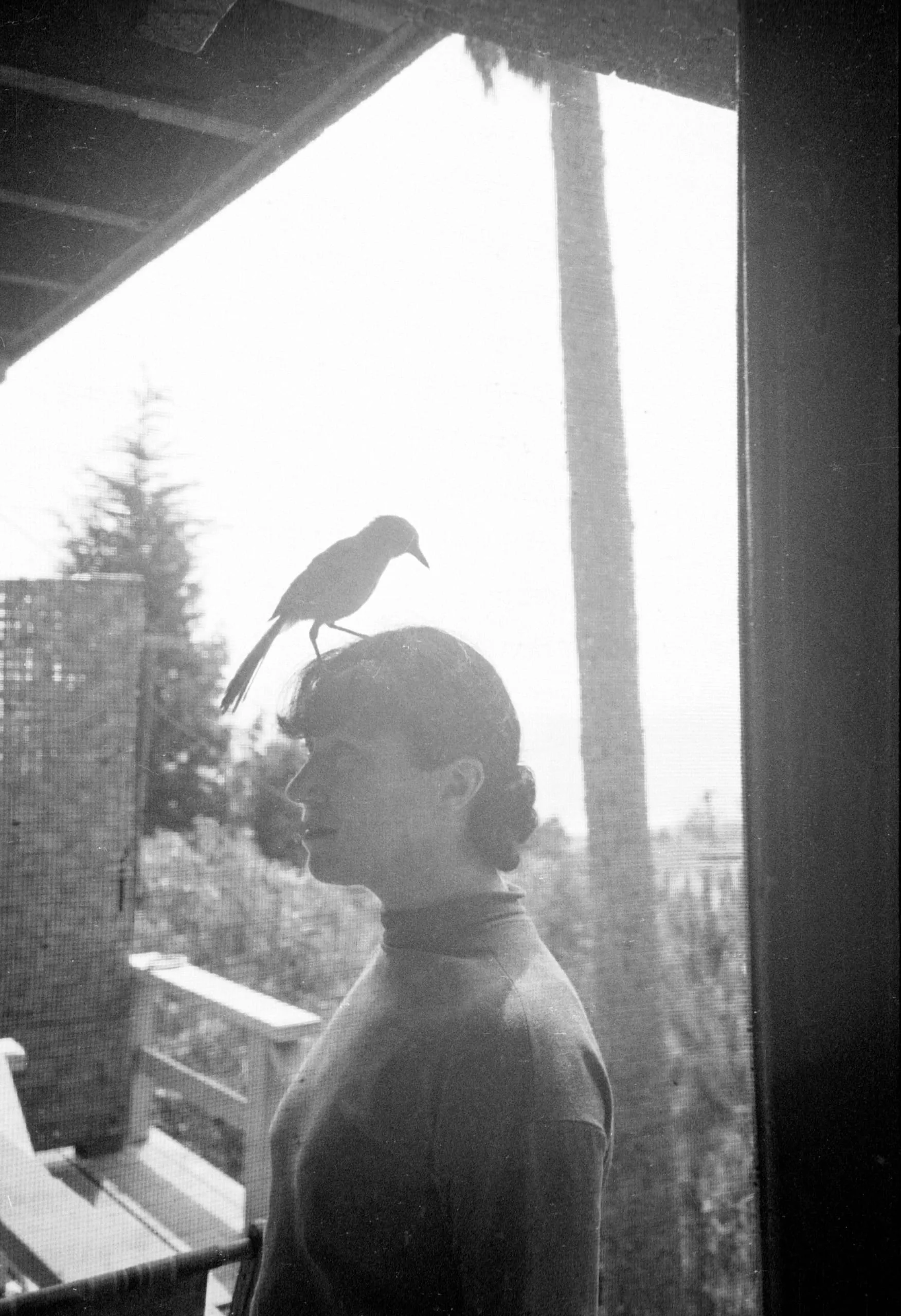 Black and white photograph, woman in profile with a bird perched on her head, backlit against an overcast sky viewed from a covered porch