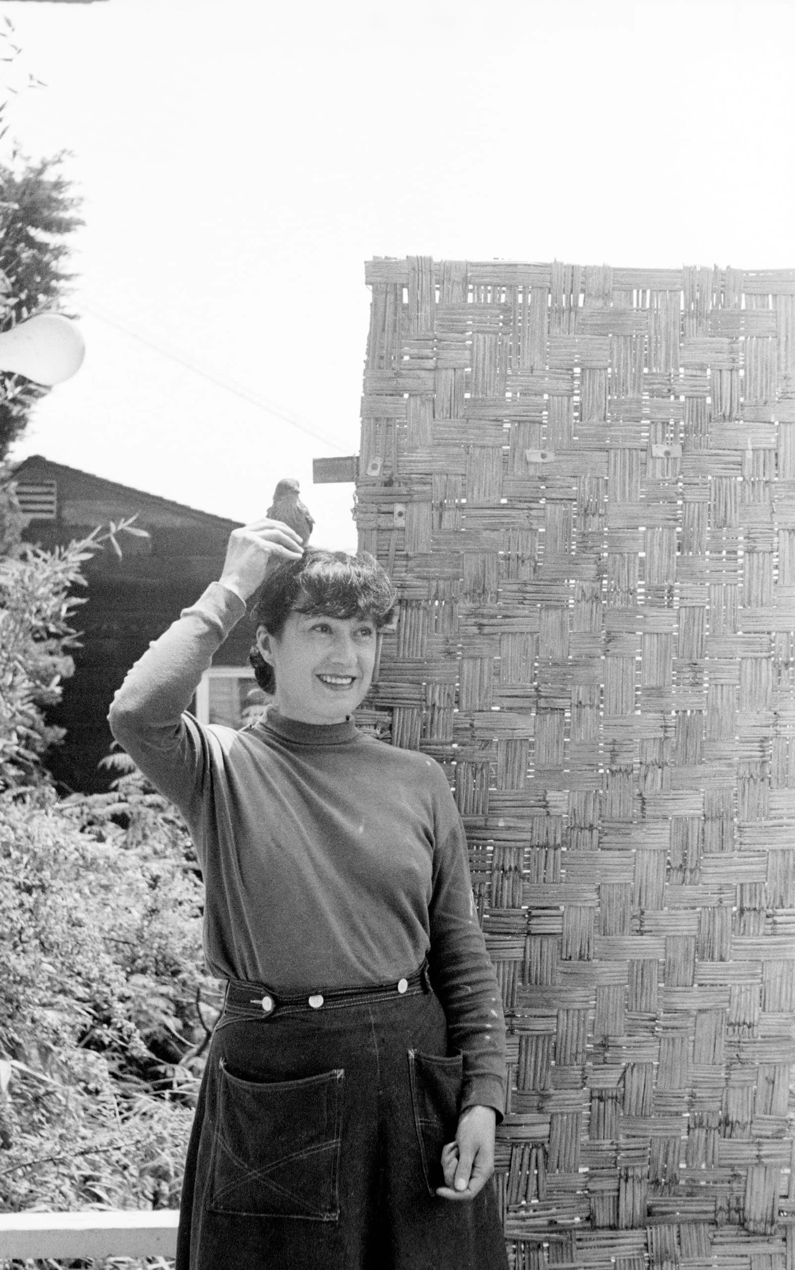 Black and white photograph of a smiling woman in a turtleneck and skirt standing outdoors beside a large woven bamboo panel