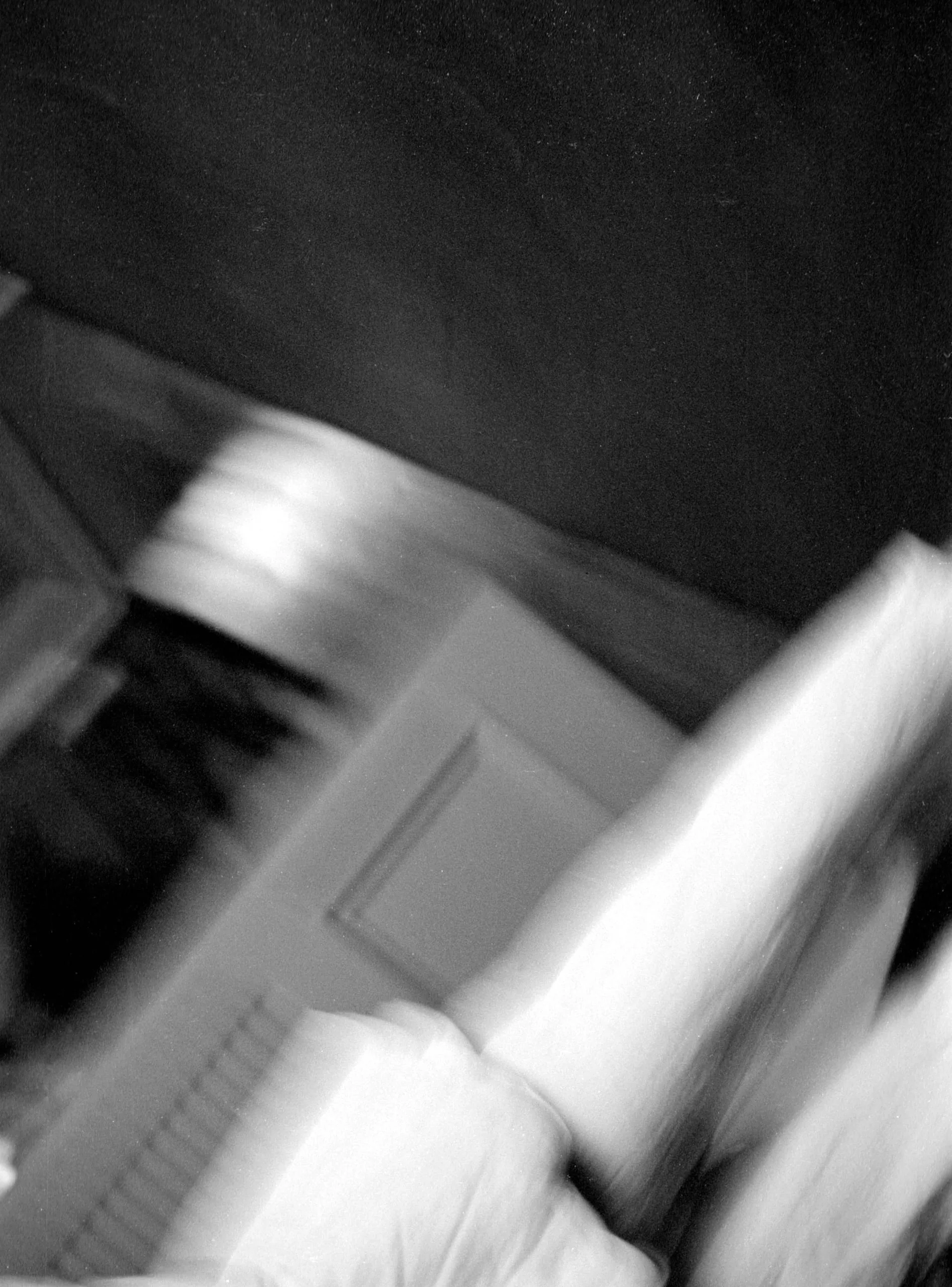 Severely motion-blurred black and white photograph of a tilted interior scene with a white door, staircase railing, and overexposed architectural elements